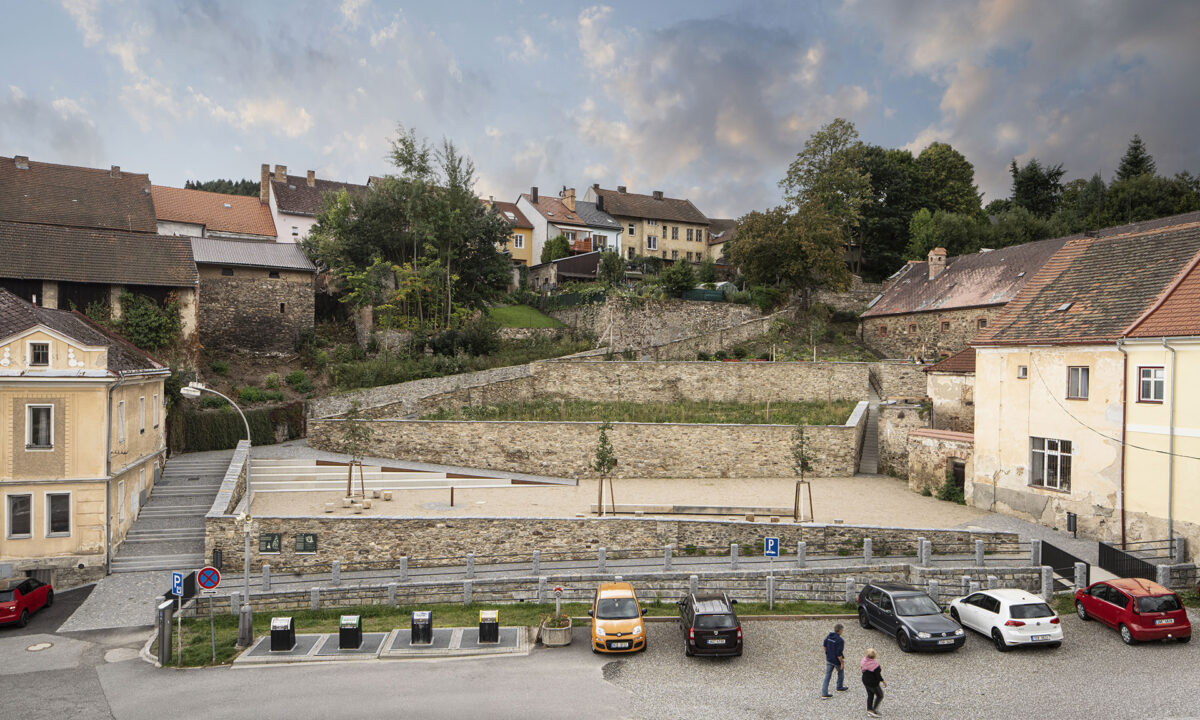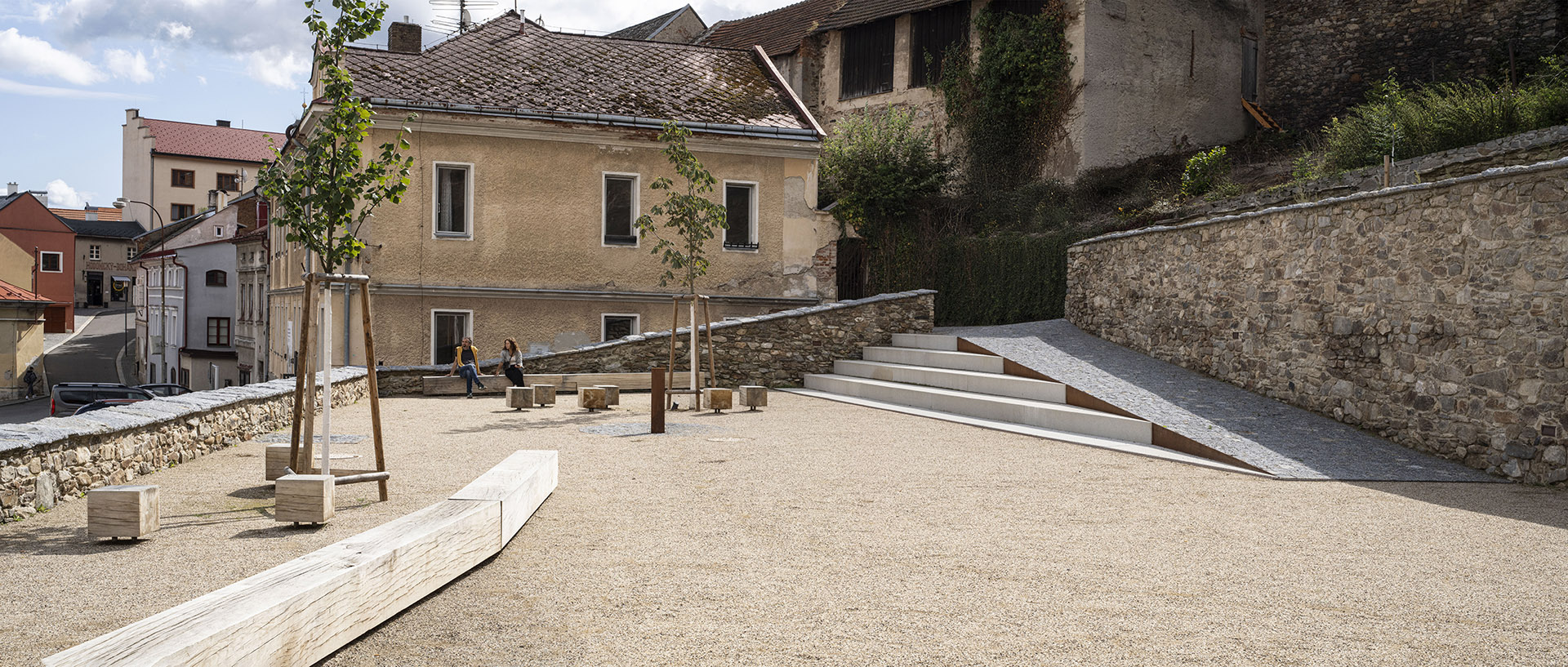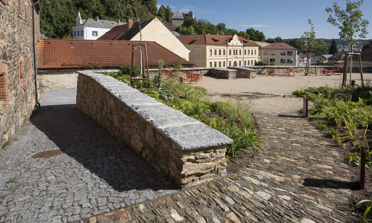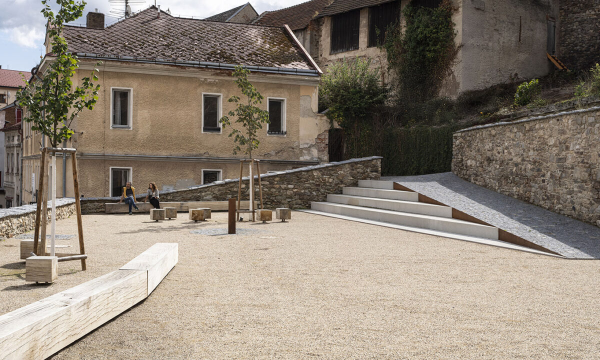 Pohled na druhou terasu, která je rampou podél budovy Pivovaru propojena s terasou první, a tak bezbariérově i s městským parterem náměstí.