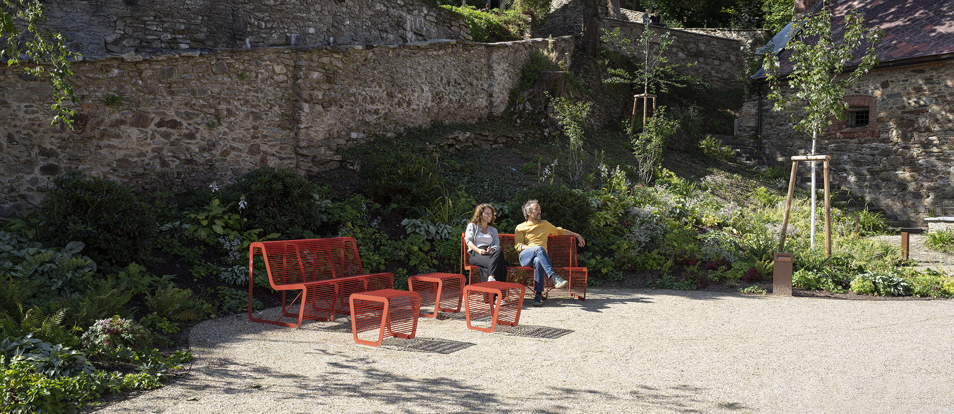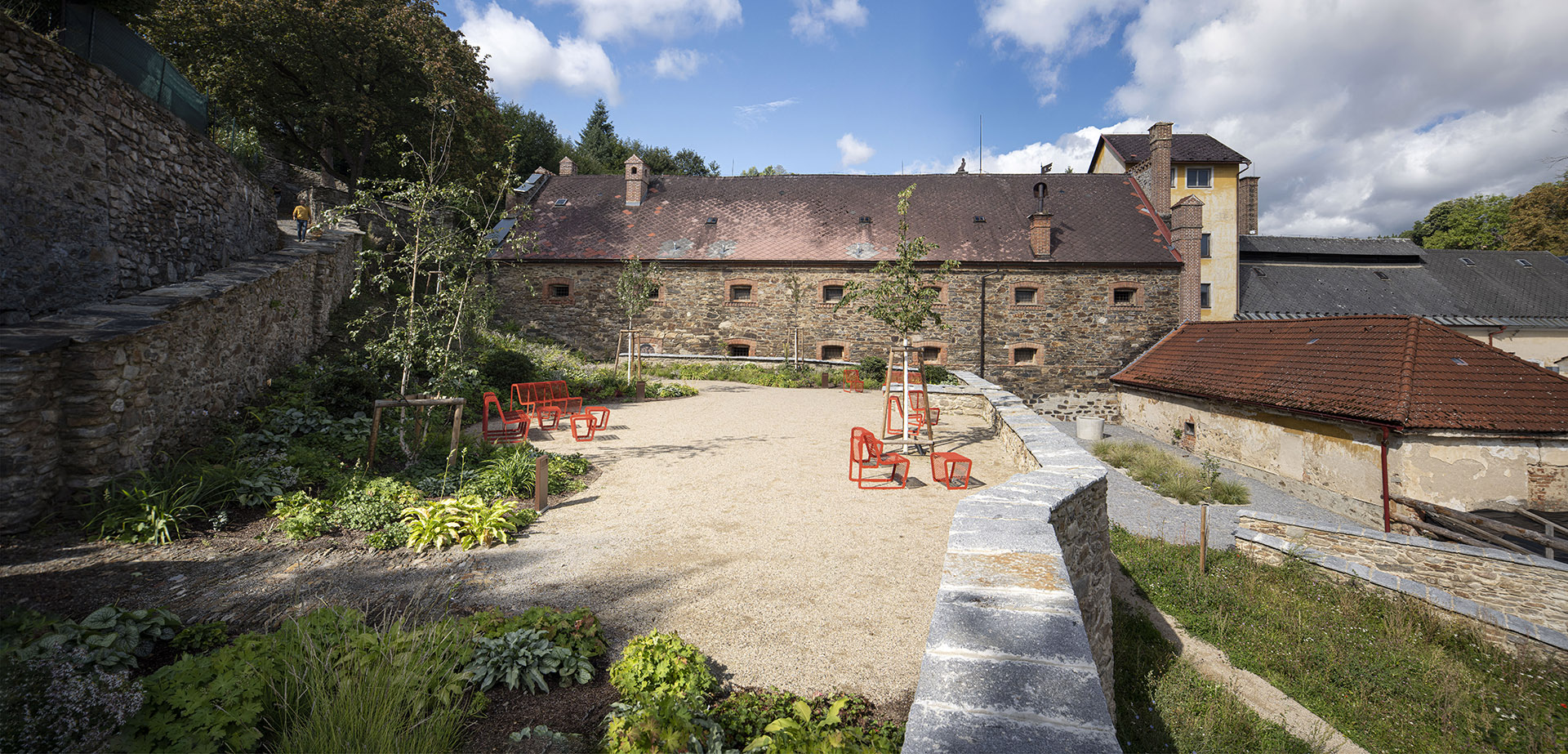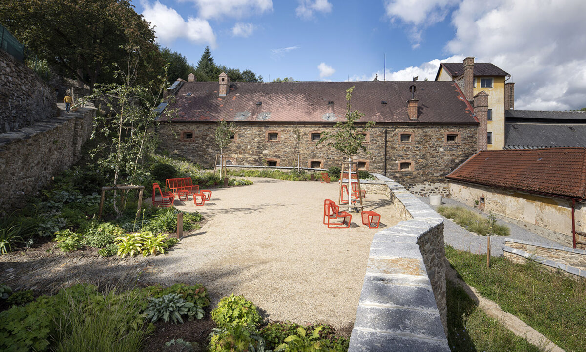 Pohled na druhou terasu, která je rampou podél budovy Pivovaru propojena s terasou první, a tak bezbariérově i s městským parterem náměstí.