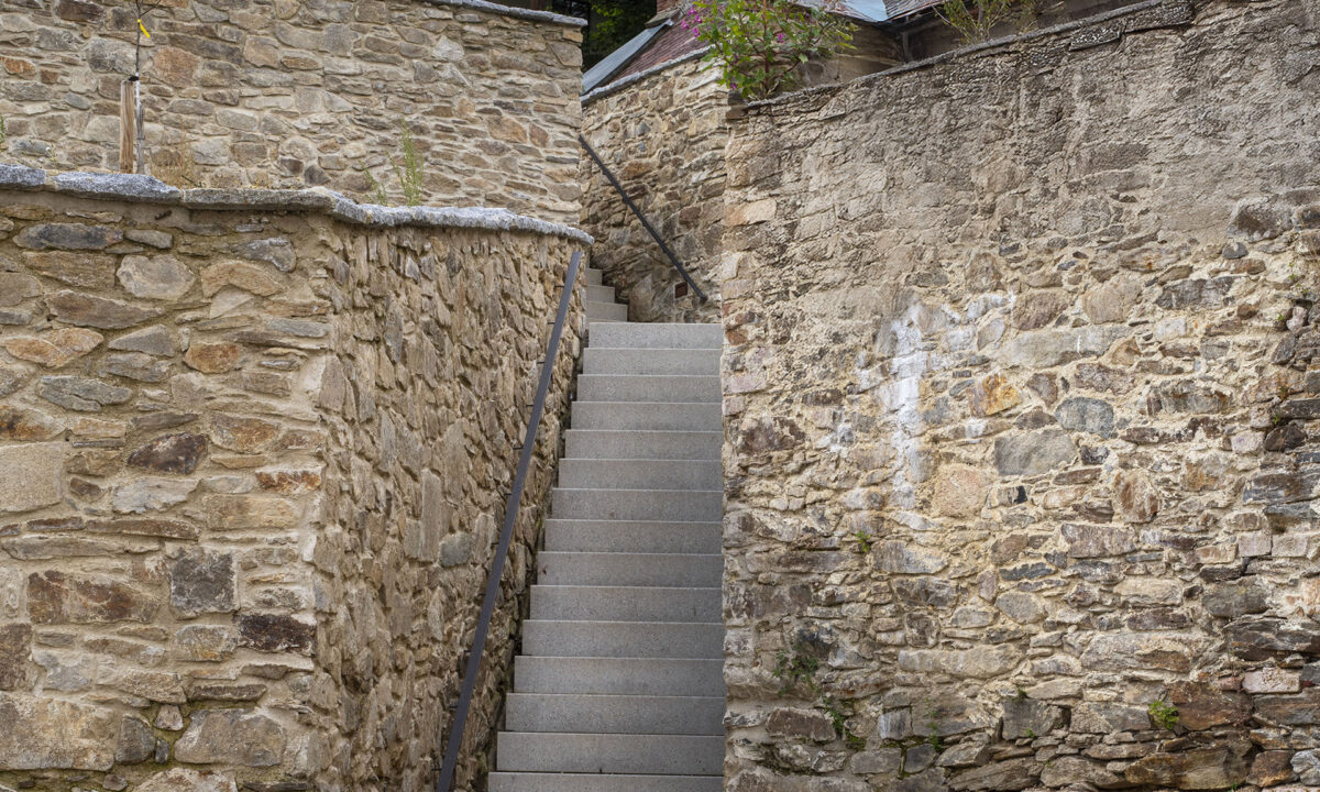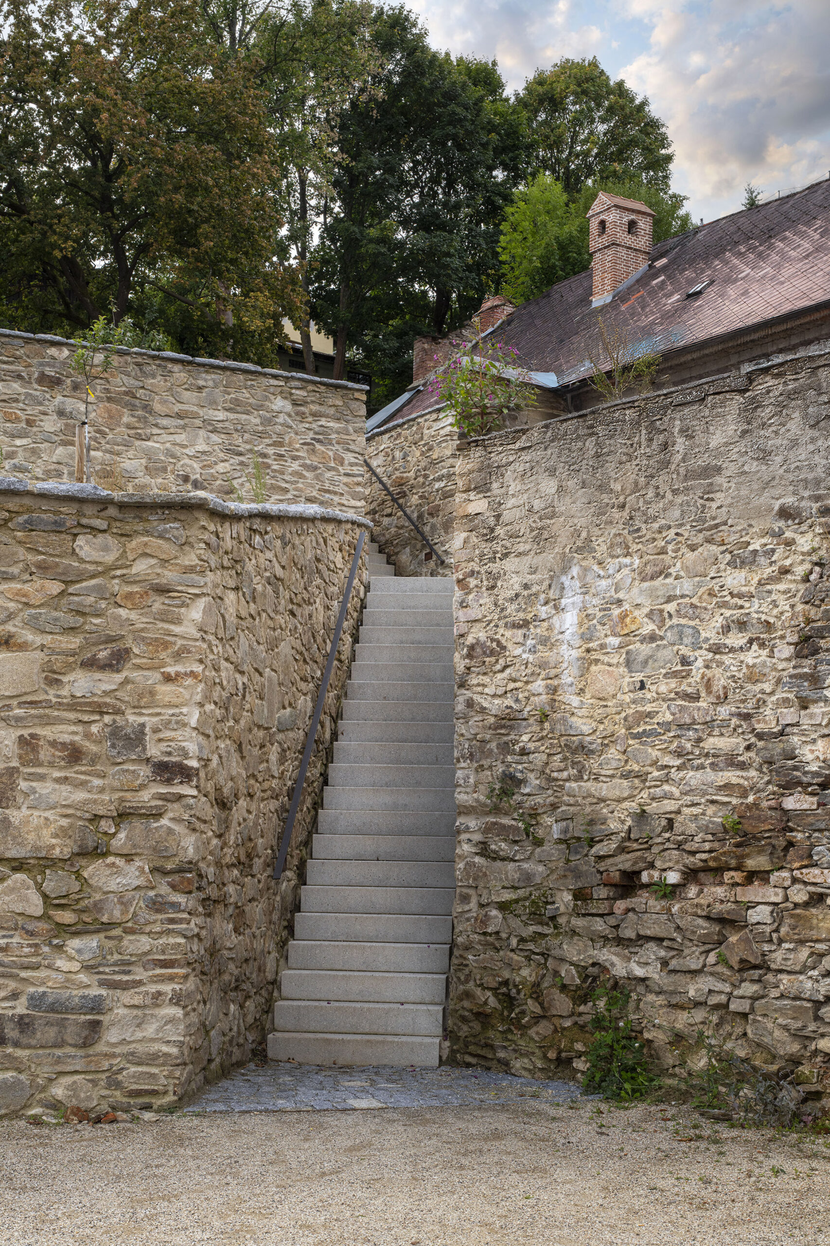 Schodiště mezi terasami bylo totálně zdevastované. Navrhli jsme proto nové schodišťové stupnrě ve stávajících pozicích s doplněnými kamennými zdmi.