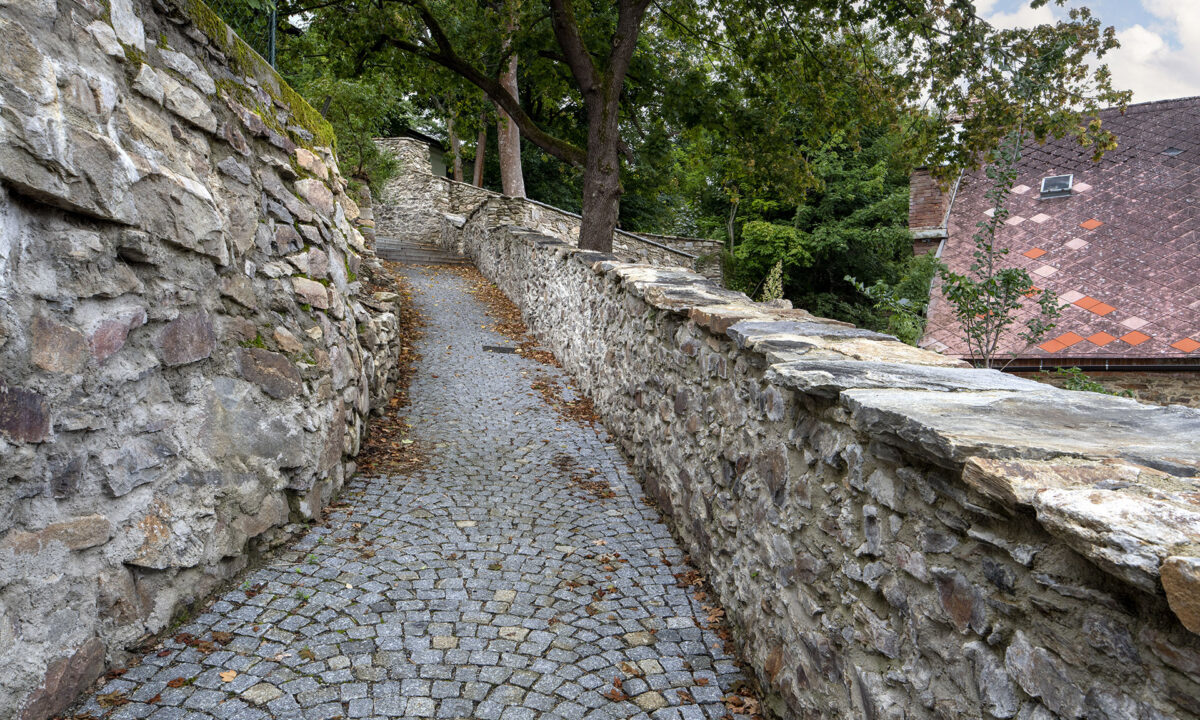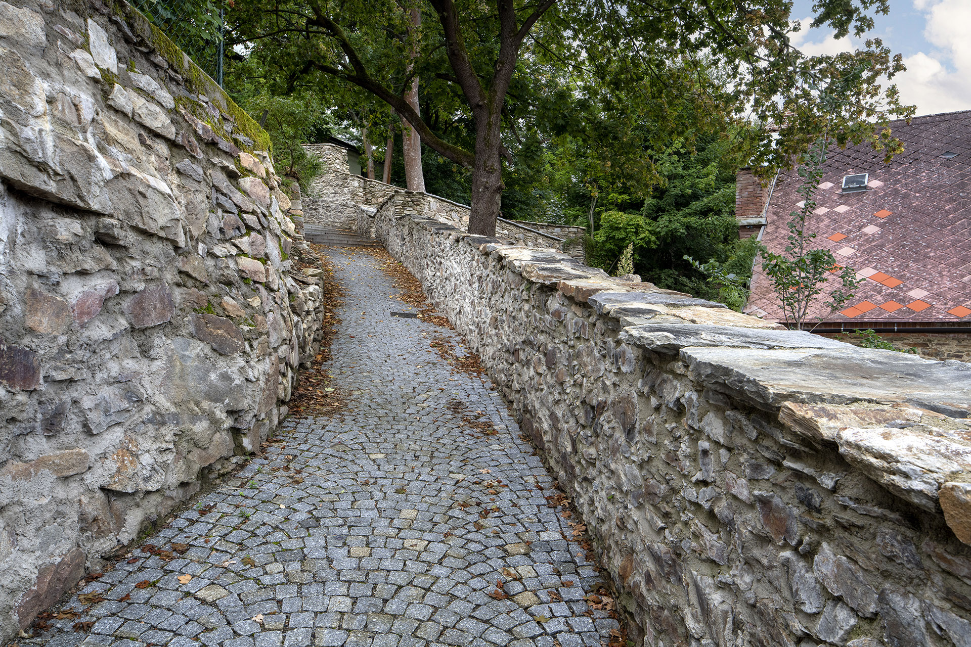 Náš nejvýraznější vstup do řešeného území pivovarských teras začíná právě v tomto momentě. Navrhujeme novou nejvyšší terasu – vyhlídku. Snažíme se tak vybalancovat zážitek z protilehlé strany Zlaté stezky, kdy po průchodu hradbami se nám otvírá pohled do údolí a protější kopec Na Chválovně. Z námi navrhované terasy vidíme Zámek a pod zámkem štít pivovaru.