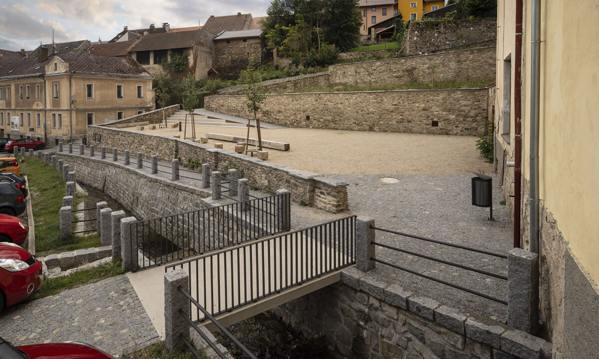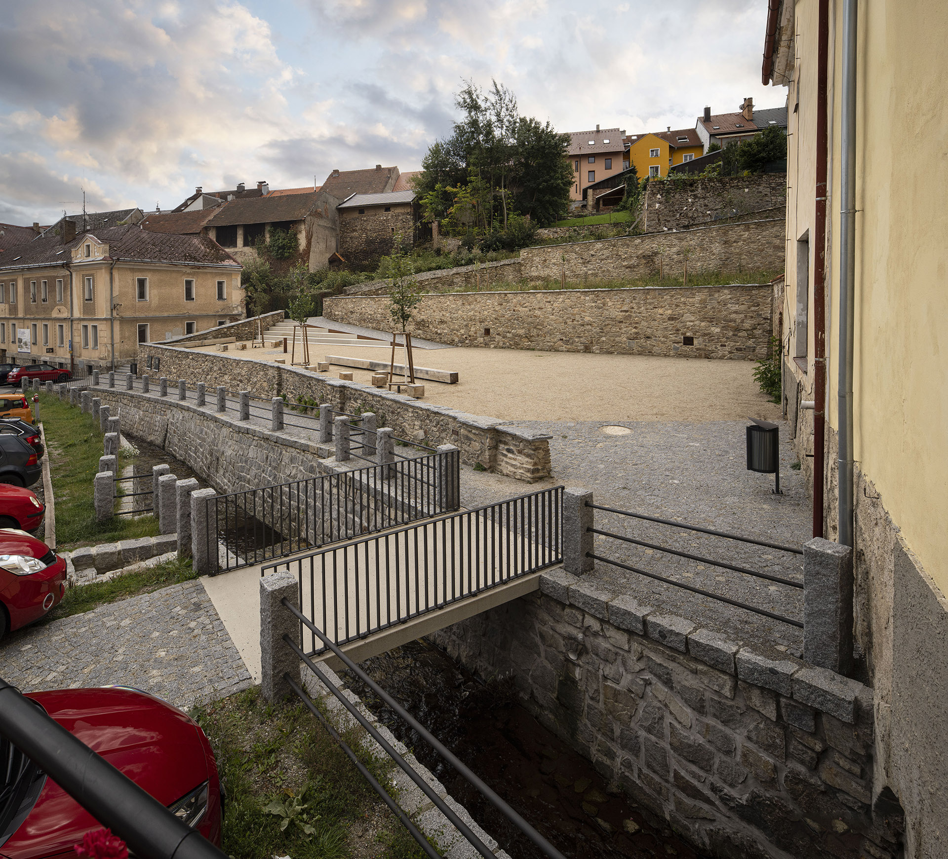V návaznosti na Pivovarské náměstí se nám v rámci projektu podařilo odhalit část Křesanovského potoku. Navrhli jsme také pěší přemostění před budovou Pivovaru, aby byly terasy z náměstí přístupné ze dvou míst a tak cesty zokruhovány.