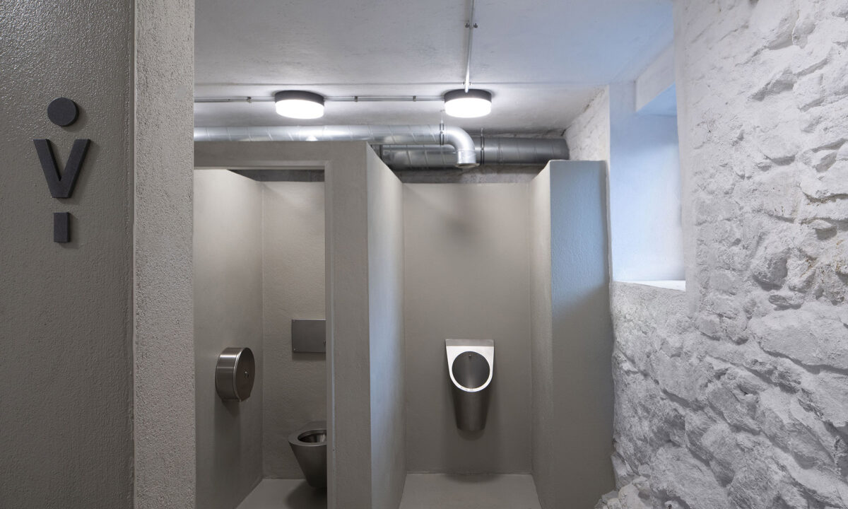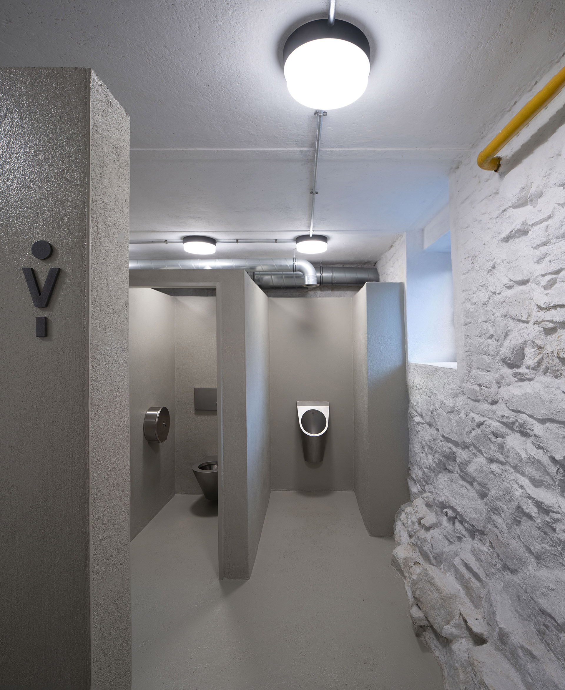 Součástí projektu rekonstrukce teras byl i návrh a realizace veřejných toalet. Ty jsou umístěny v suterénu sousedního objektu a přístupné po rampě.