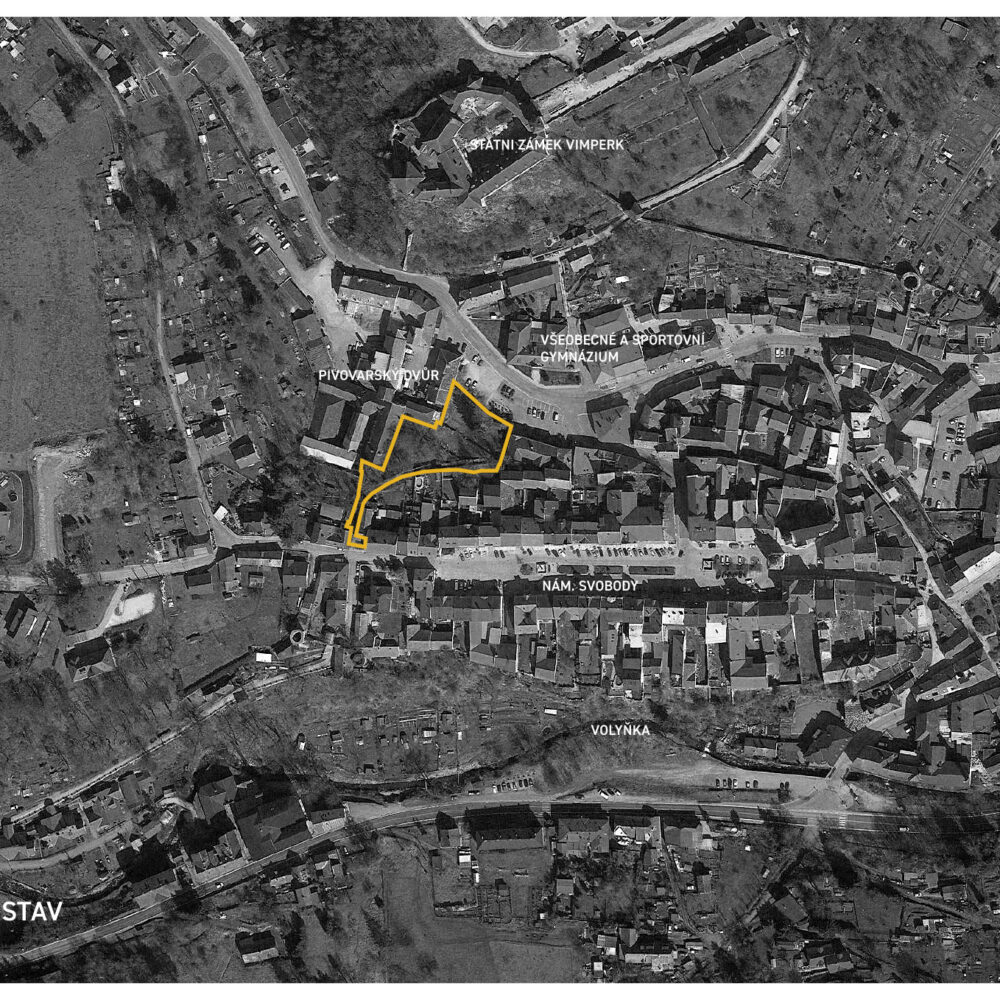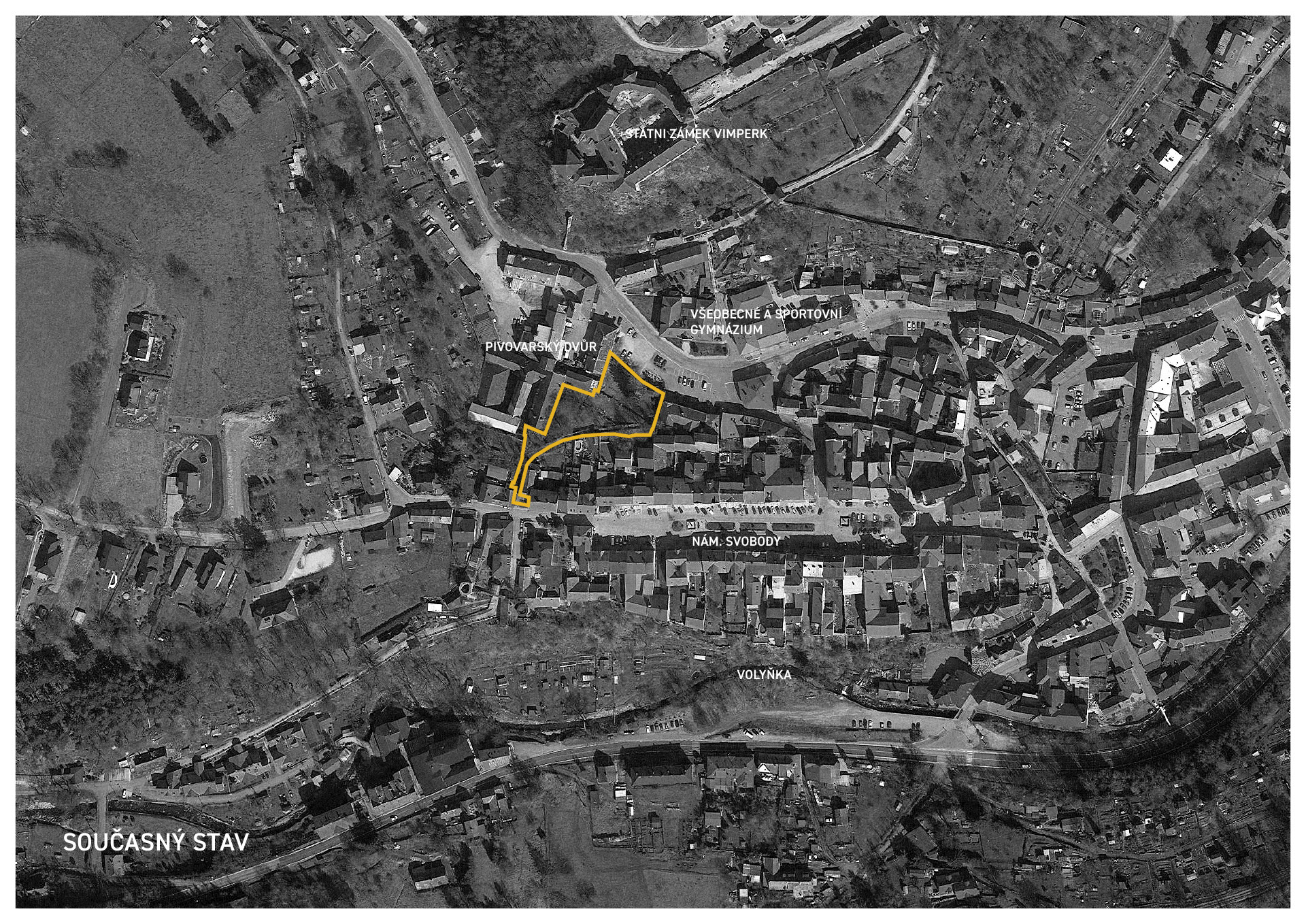 Navracíme terasám původní geometrii, kterou doplňujeme o novou horní terasu – vyhlídku na zámek s vazbou na průchod Zlaté stezky městem. Terasy definujeme jako uzavřené zahrady za zdí a soustředíme se na obyvatelnost tohoto veřejného prostoru/společného místa. Atmosféry a funkce teras jsou komponované v rytmu aktivních a relaxačních ploch. Navrhujeme maximální přístupnost teras po rampách (kočárky, kola, vozíky). Terasy se stávají svébytným hodnotným prostorem ve středu města, který má potenciál být užíván obyvateli Vimperku všech věkových kategorií. Rekonstrukci teras vnímáme jako impuls k proměně celého území a k funkční interakci okolních budovy pivovaru a dalších městských objektů. Součástí rekonstrukce bylo i odkrytí koryta Křesanovského potoka a realizace veřejných toalet.