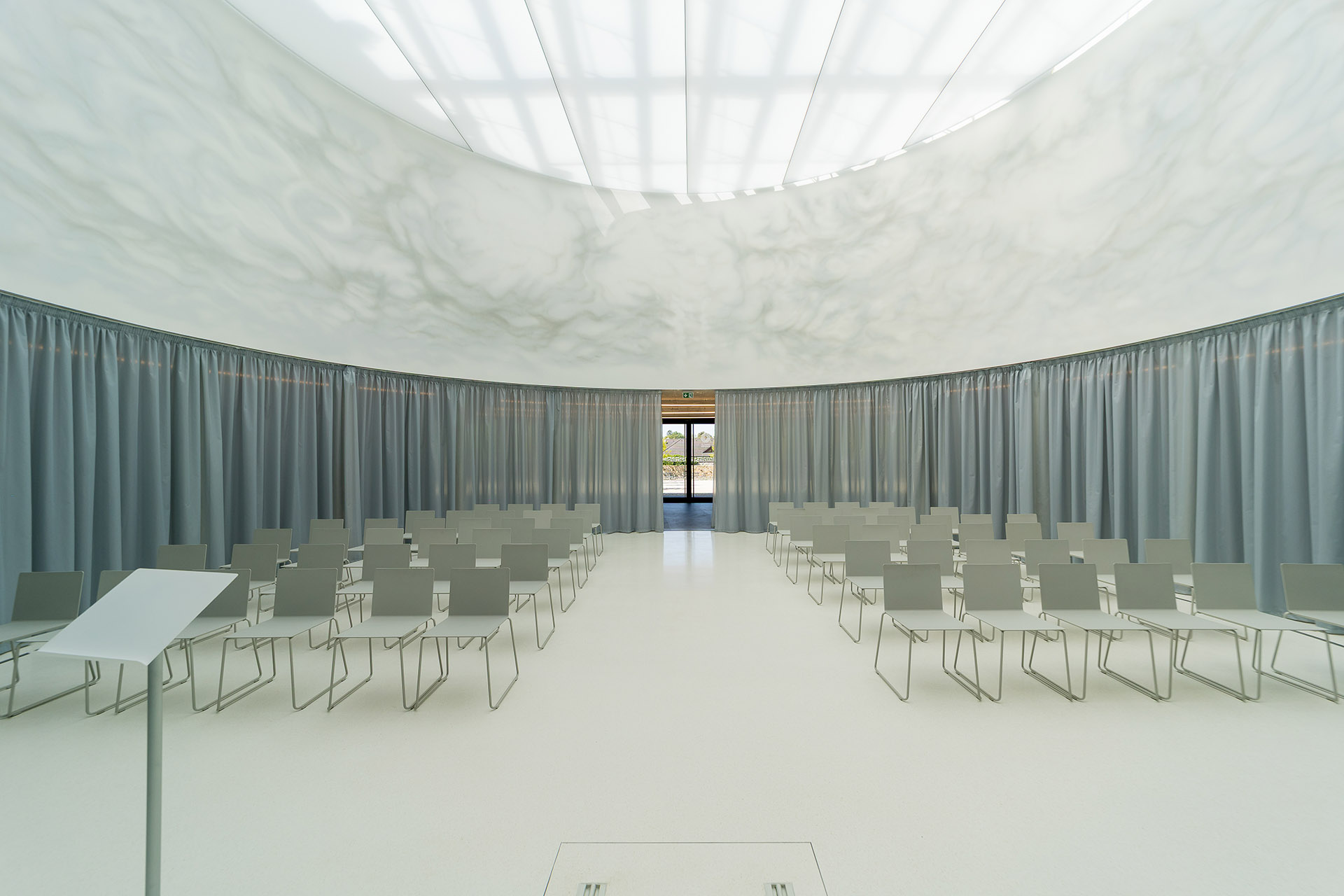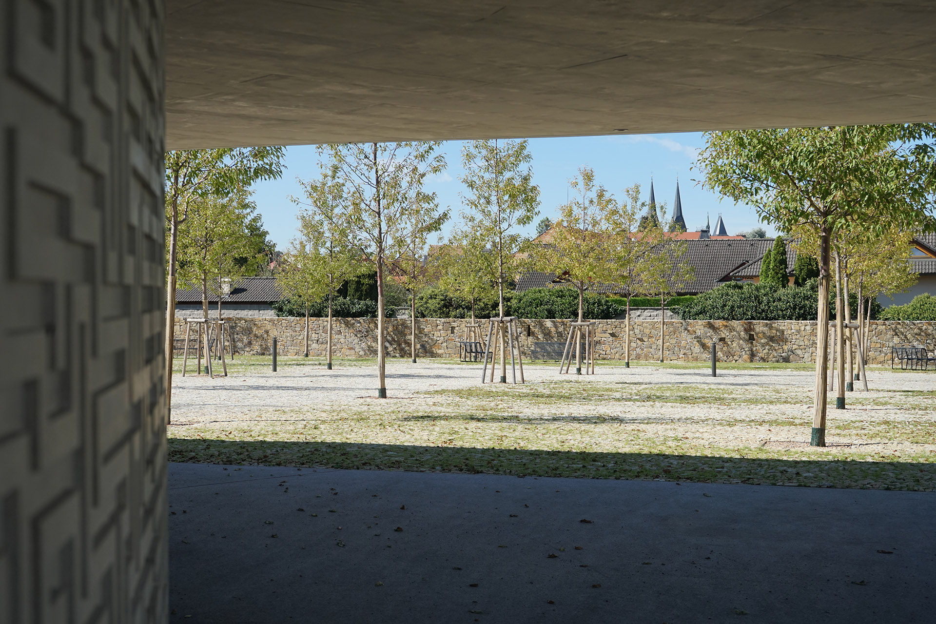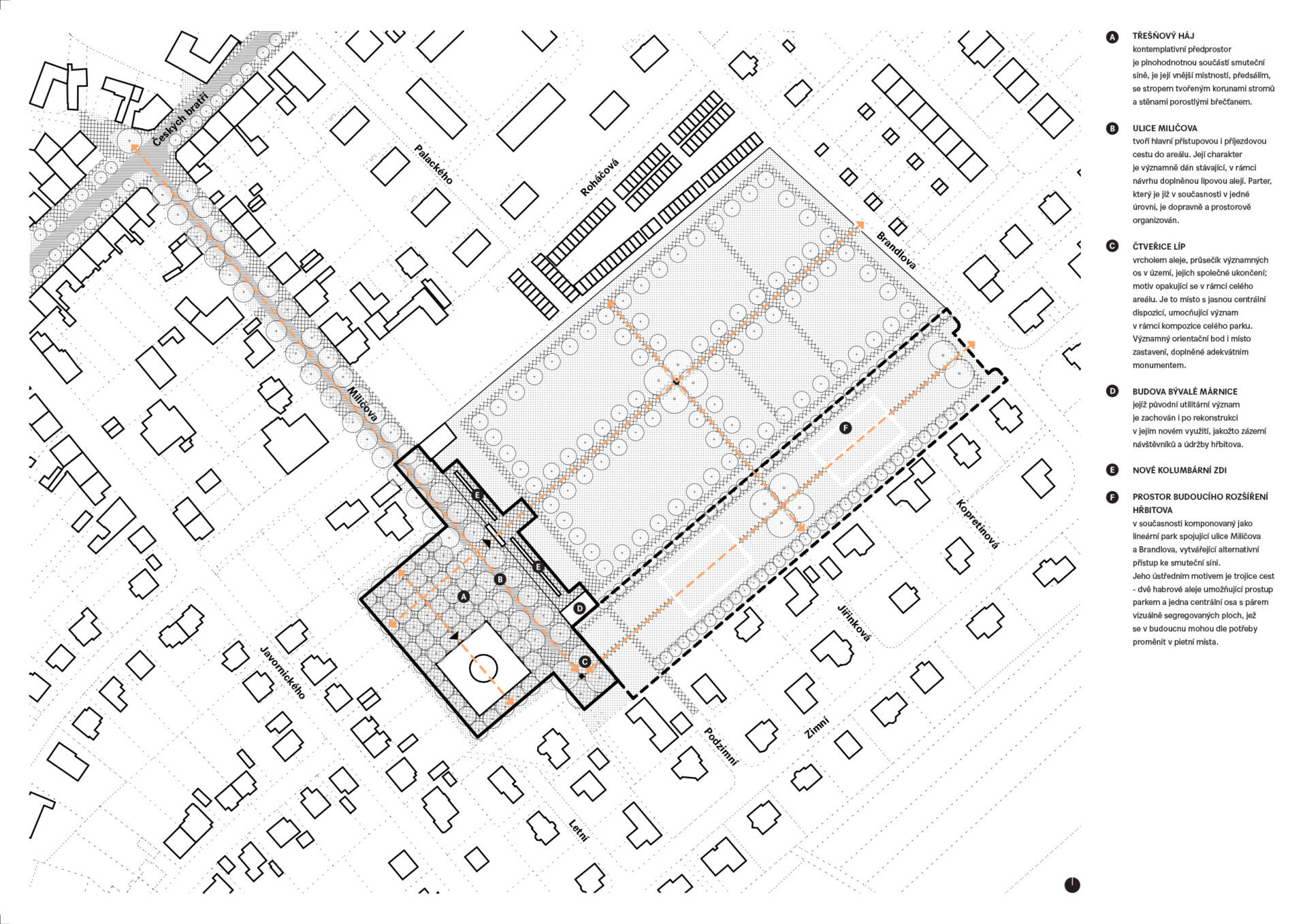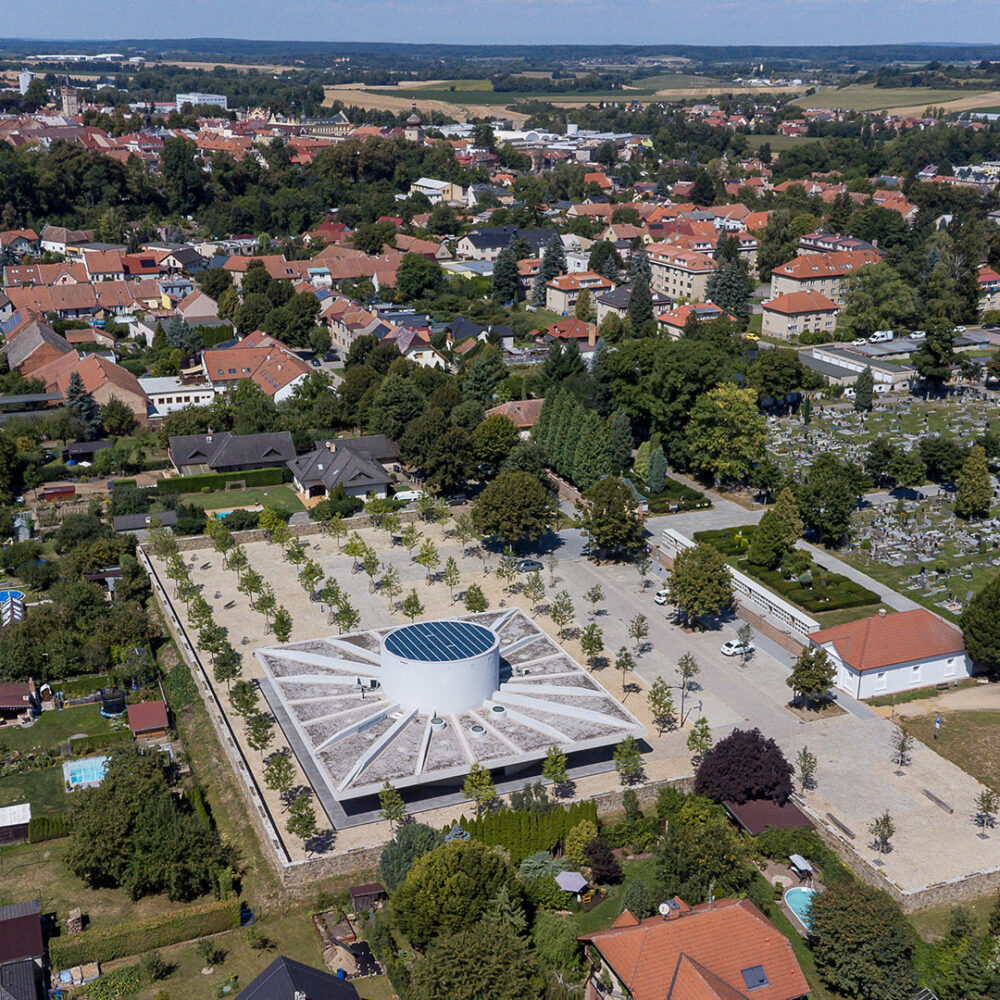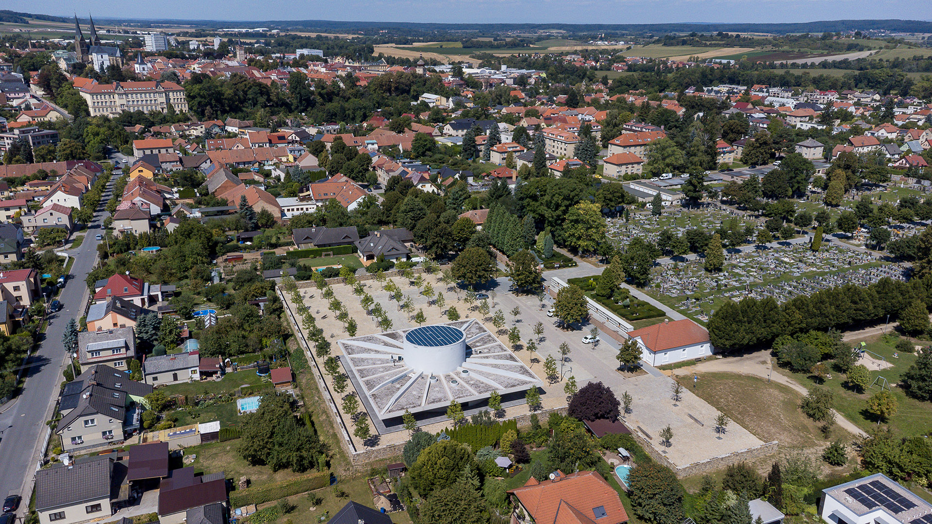 Předprostor obřadní síně definujeme kamennými zdmi a vysazujeme v něm třešňový sad v pravidelném rastru. Mezi třešně vkládáme čtverec – místo smutečního setkávání, které je ve výšce 3 m přikryto deskou. Tuto desku perforujeme vysokým válcem, jenž vytváří prostor posledního rozloučení. Architektura obřadní síně je tak založena na kontrastu barevném/světelném i geometrickém. Základní půdorys v kontextu urbanismu je čtvercový a tmavý, zatímco interiér má kruhový půdorys a bílou obřadní síň ve tvaru válce, kterou prosvětluje střešní světlík. Vnější tmavá betonová fasáda je zjemněna motivem labyrintu, který plní jak estetickou, tak symbolickou funkci. Povrch stěny v interiéru bílé obřadní síně je řešen jemnou nástěnnou abstraktní malbou.