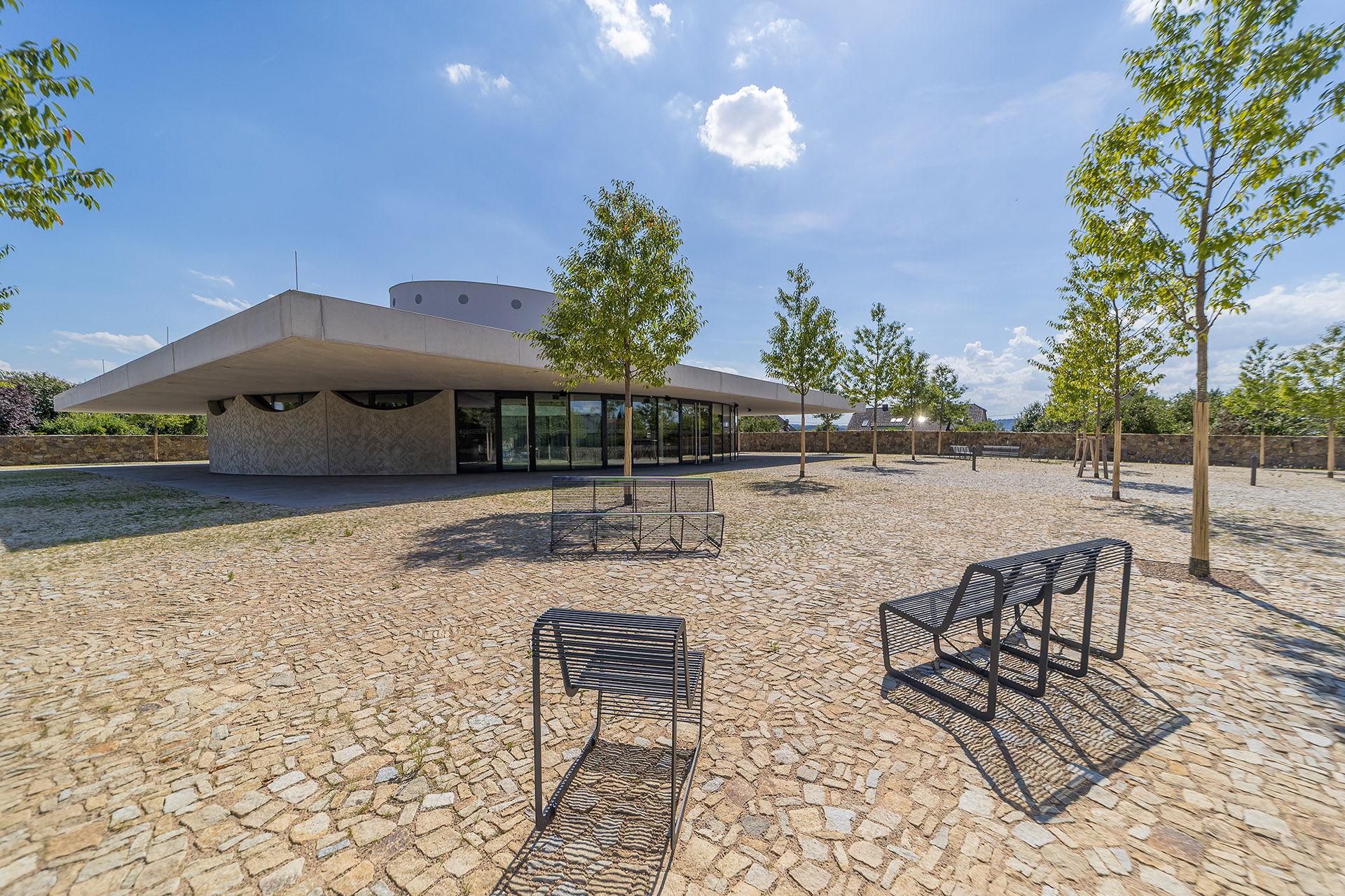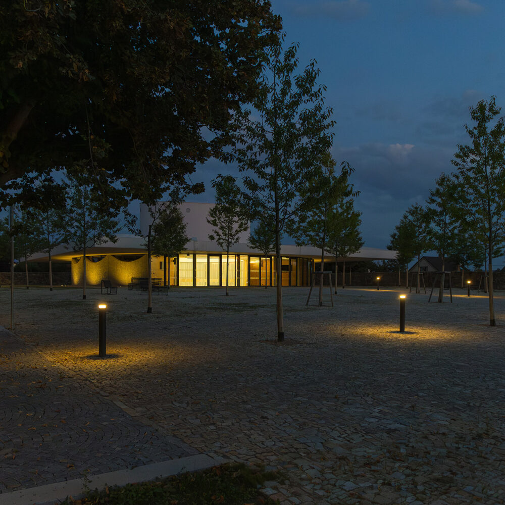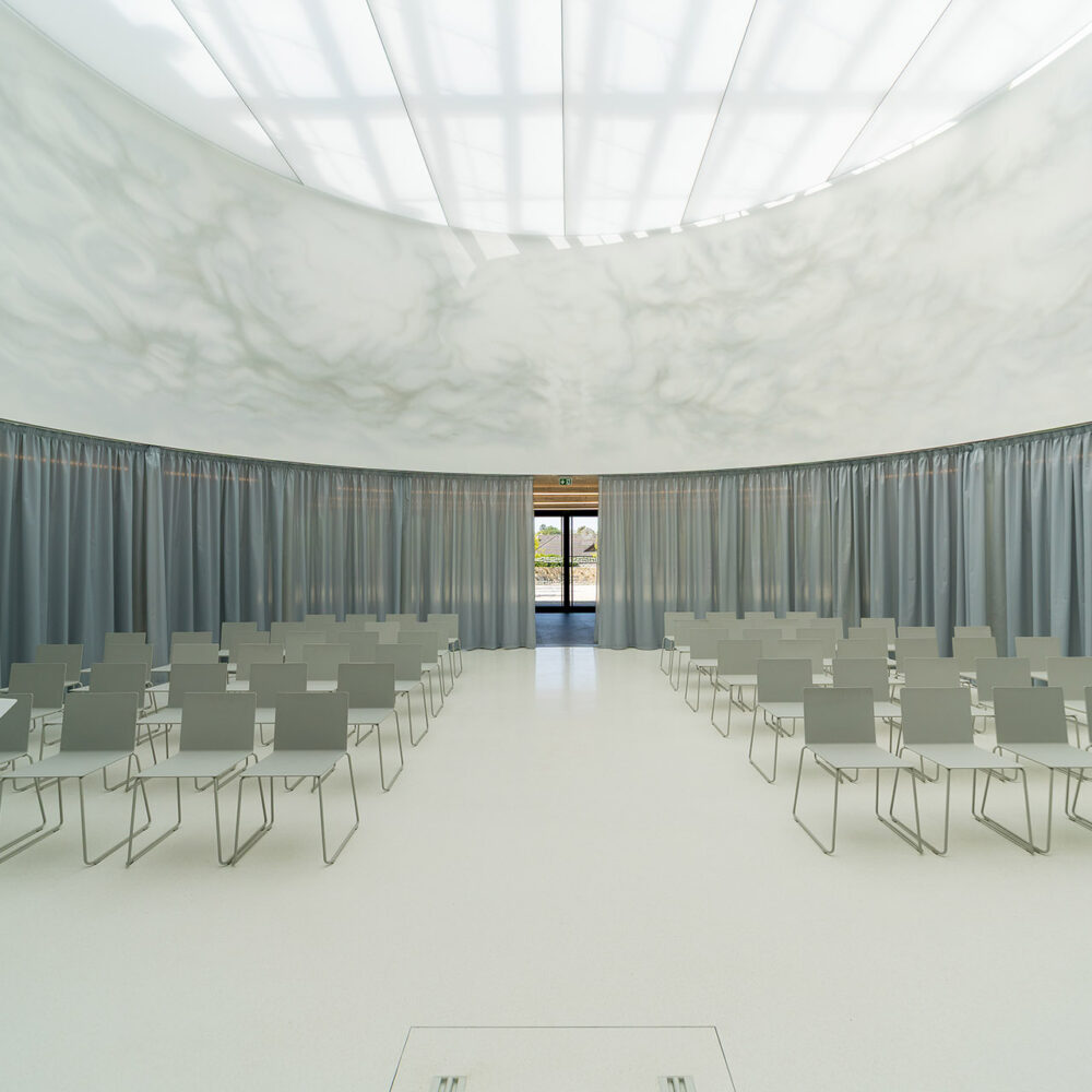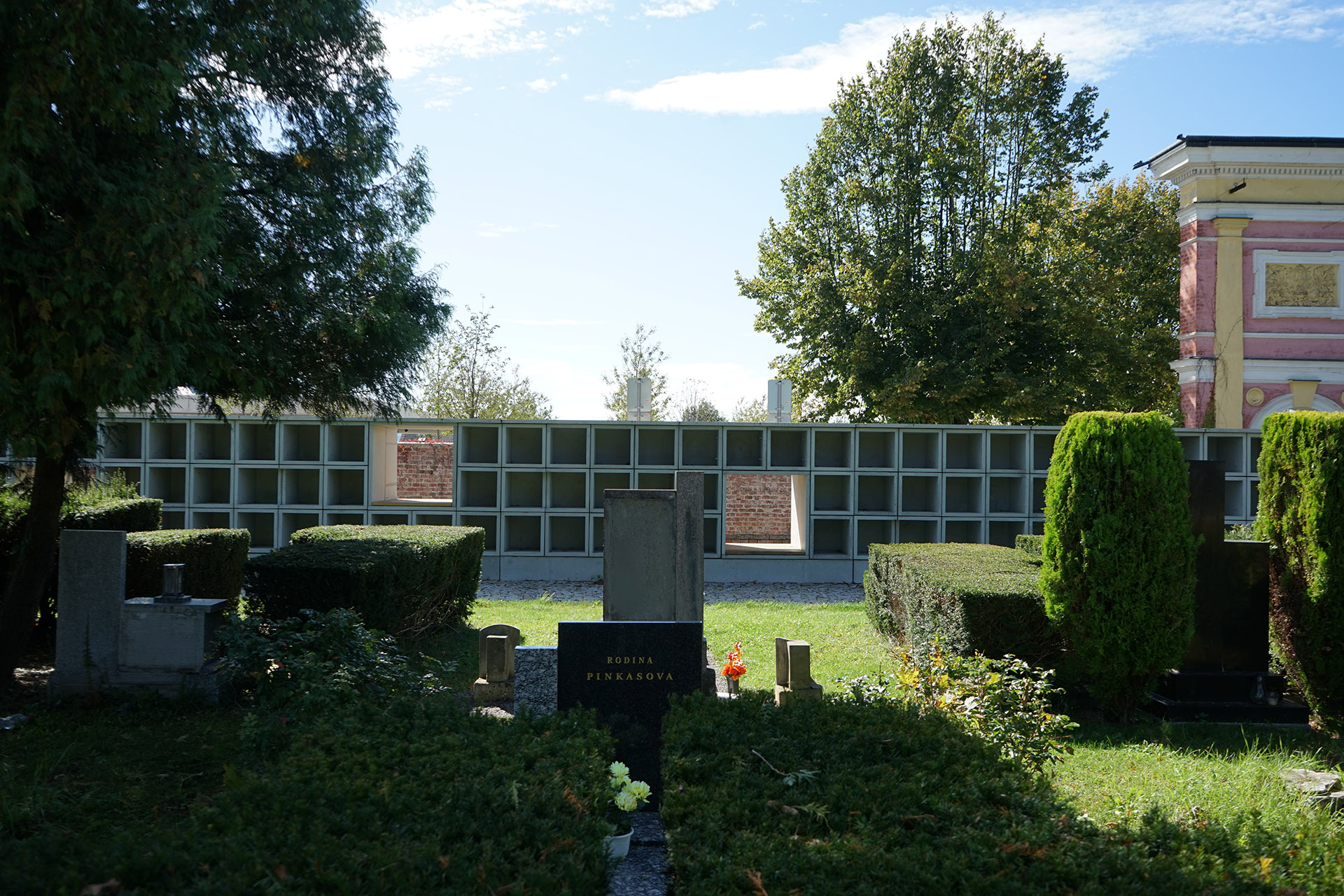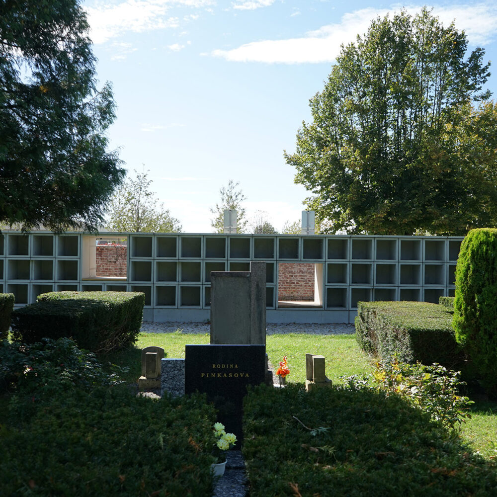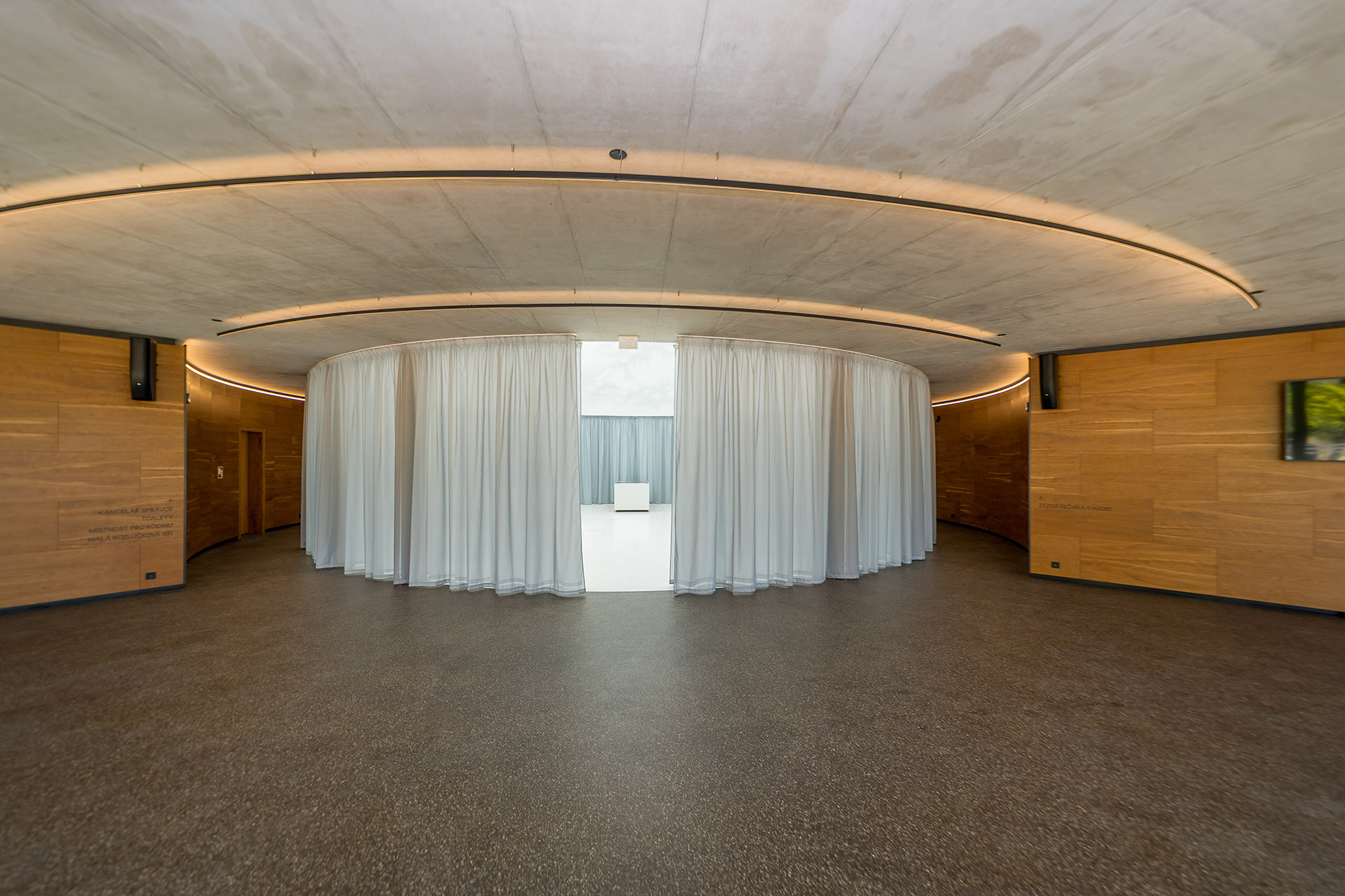 Předprostor obřadní síně definujeme kamennými zdmi a vysazujeme v něm třešňový sad v pravidelném rastru. Mezi třešně vkládáme čtverec – místo smutečního setkávání, které je ve výšce 3 m přikryto deskou. Tuto desku perforujeme vysokým válcem, jenž vytváří prostor posledního rozloučení. Architektura obřadní síně je tak založena na kontrastu barevném/světelném i geometrickém. Základní půdorys v kontextu urbanismu je čtvercový a tmavý, zatímco interiér má kruhový půdorys a bílou obřadní síň ve tvaru válce, kterou prosvětluje střešní světlík. Vnější tmavá betonová fasáda je zjemněna motivem labyrintu, který plní jak estetickou, tak symbolickou funkci. Povrch stěny v interiéru bílé obřadní síně je řešen jemnou nástěnnou abstraktní malbou.