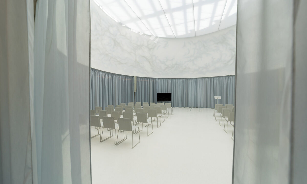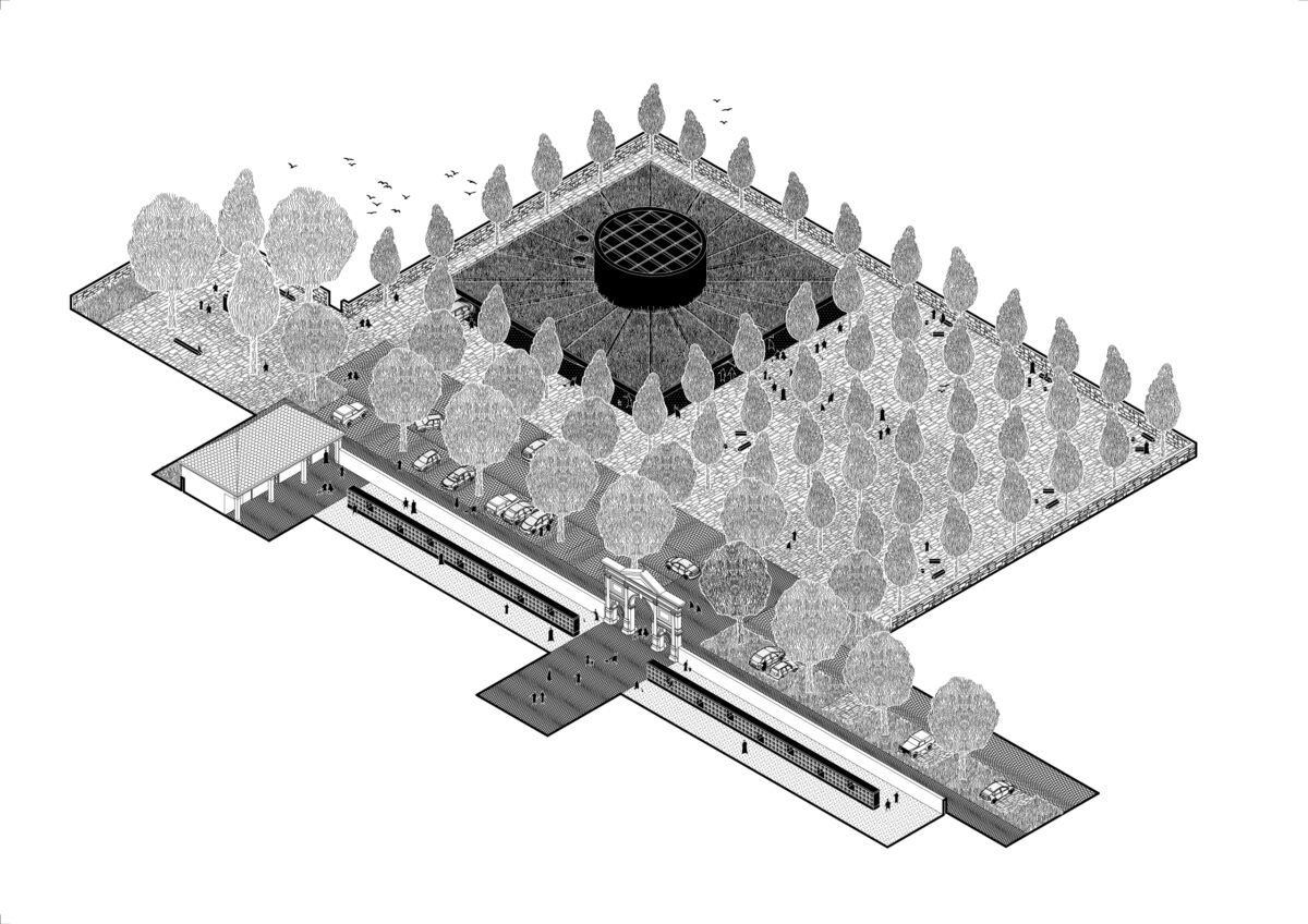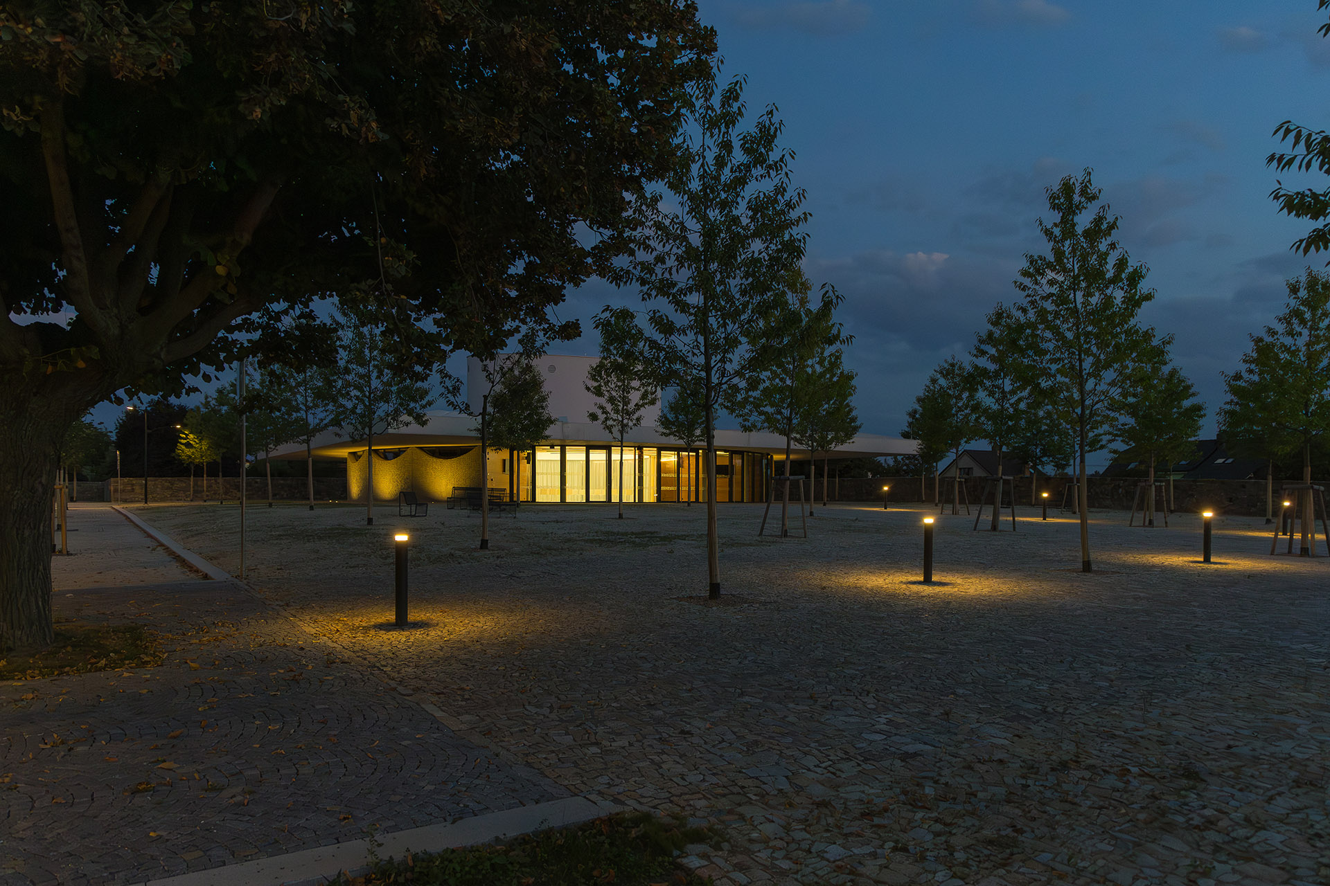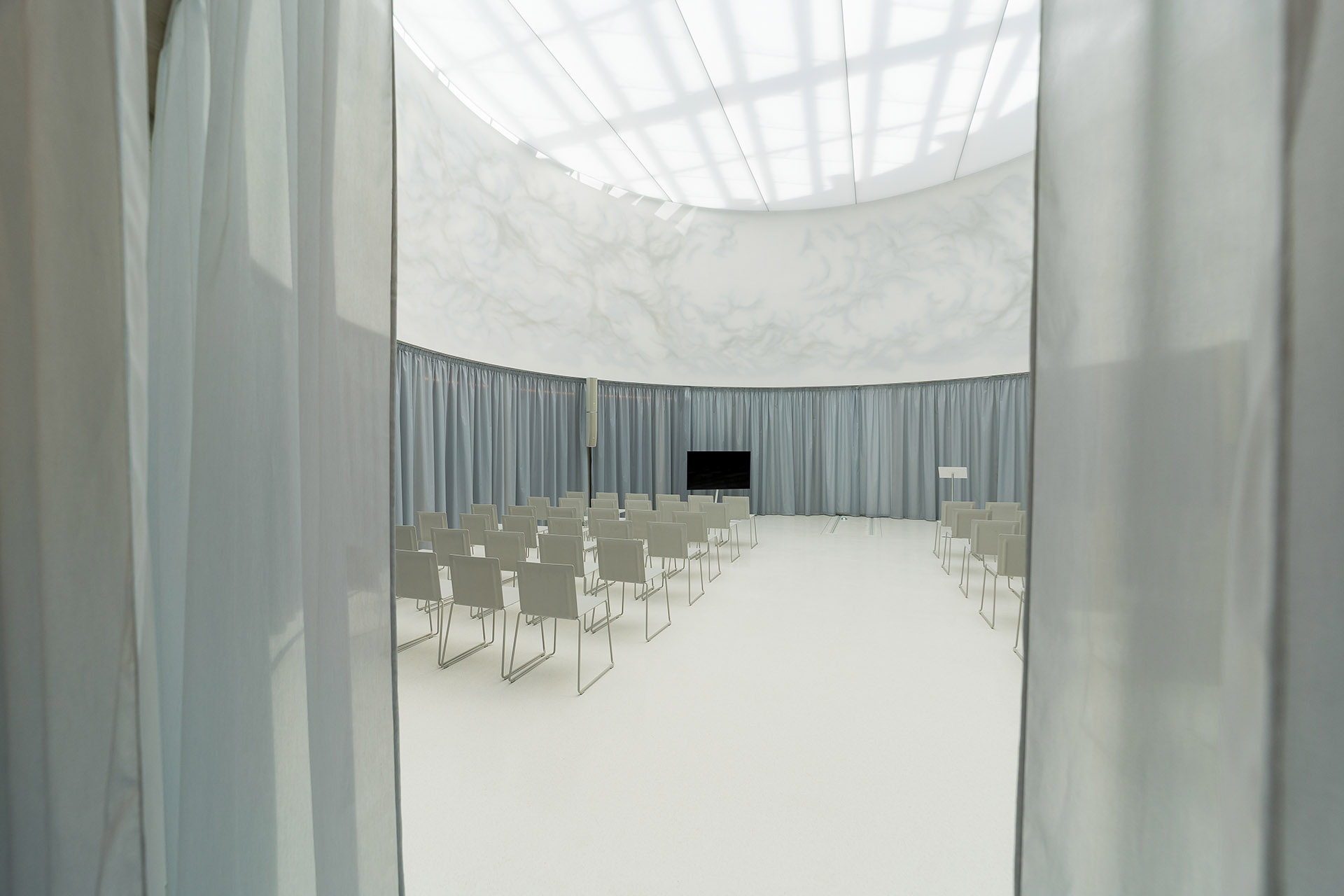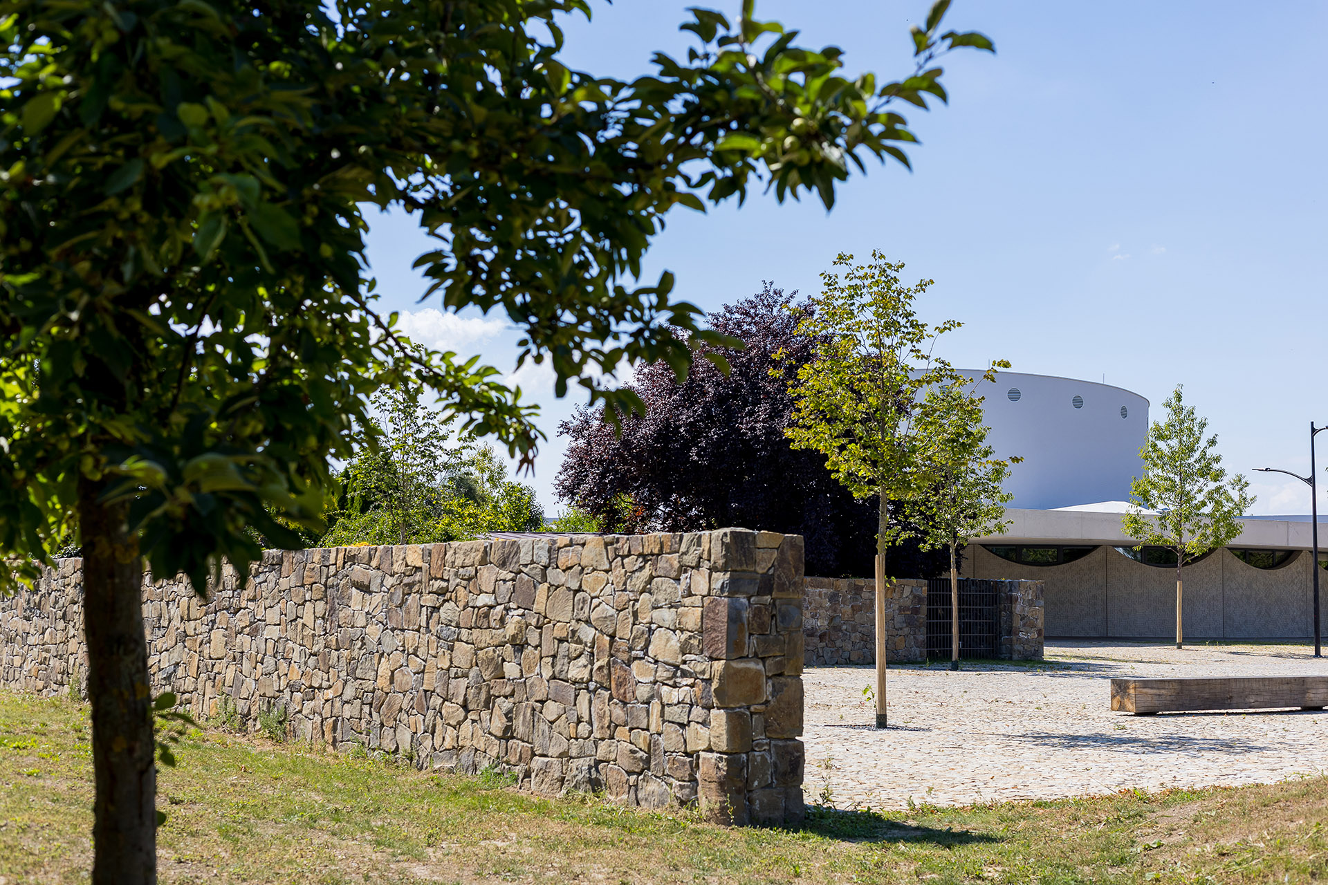 Předprostor obřadní síně definujeme kamennými zdmi a vysazujeme v něm třešňový sad v pravidelném rastru. Mezi třešně vkládáme čtverec – místo smutečního setkávání, které je ve výšce 3 m přikryto deskou. Tuto desku perforujeme vysokým válcem, jenž vytváří prostor posledního rozloučení. Architektura obřadní síně je tak založena na kontrastu barevném/světelném i geometrickém. Základní půdorys v kontextu urbanismu je čtvercový a tmavý, zatímco interiér má kruhový půdorys a bílou obřadní síň ve tvaru válce, kterou prosvětluje střešní světlík. Vnější tmavá betonová fasáda je zjemněna motivem labyrintu, který plní jak estetickou, tak symbolickou funkci. Povrch stěny v interiéru bílé obřadní síně je řešen jemnou nástěnnou abstraktní malbou.