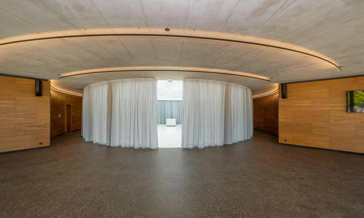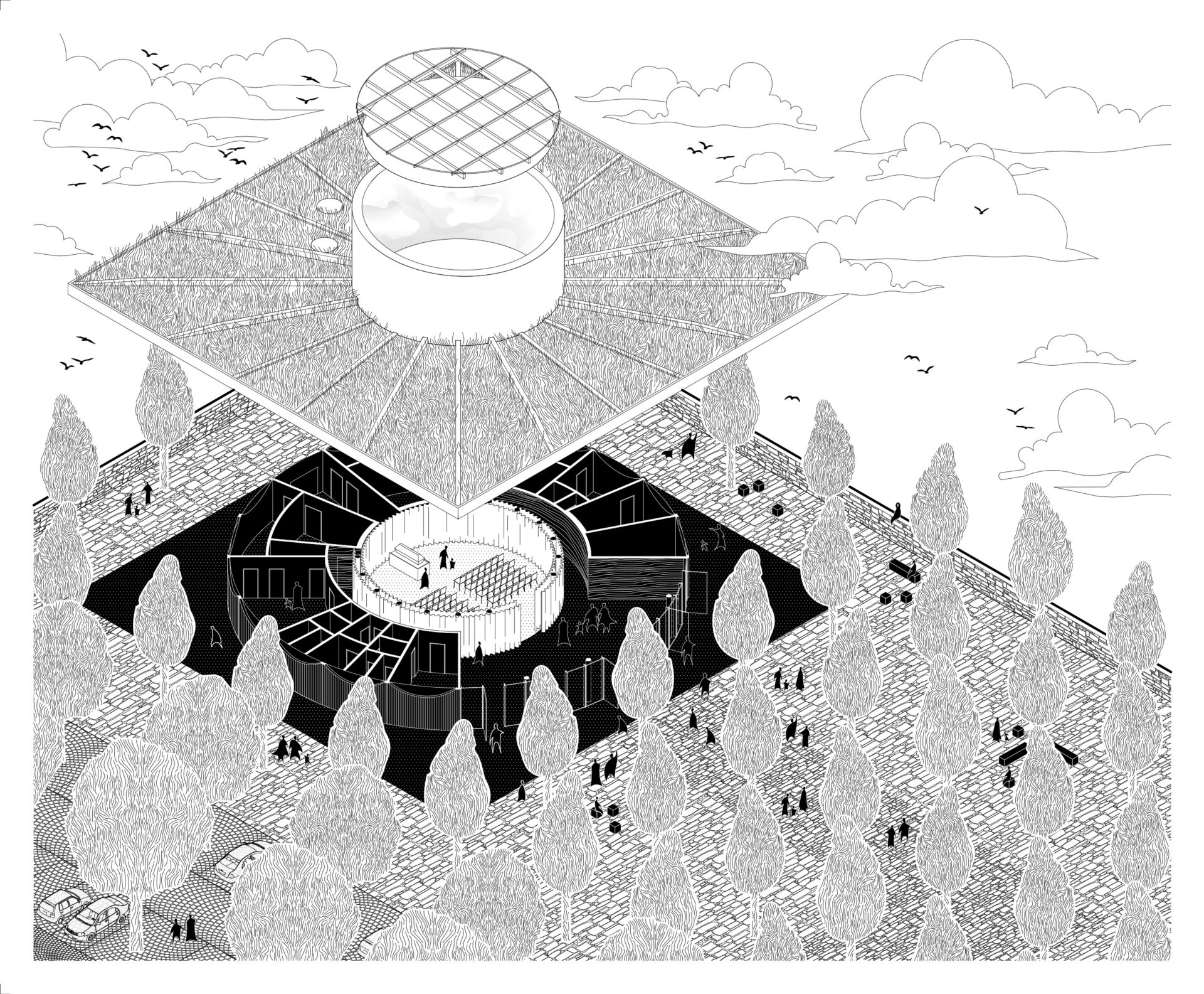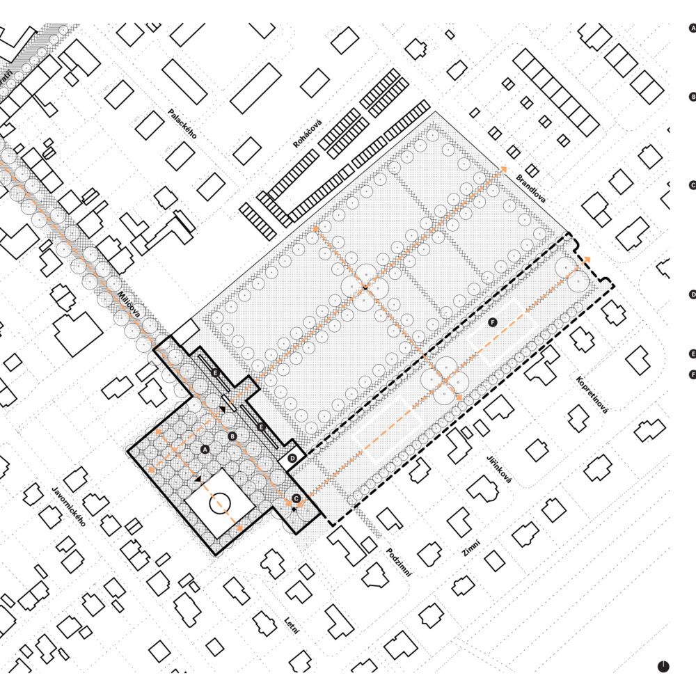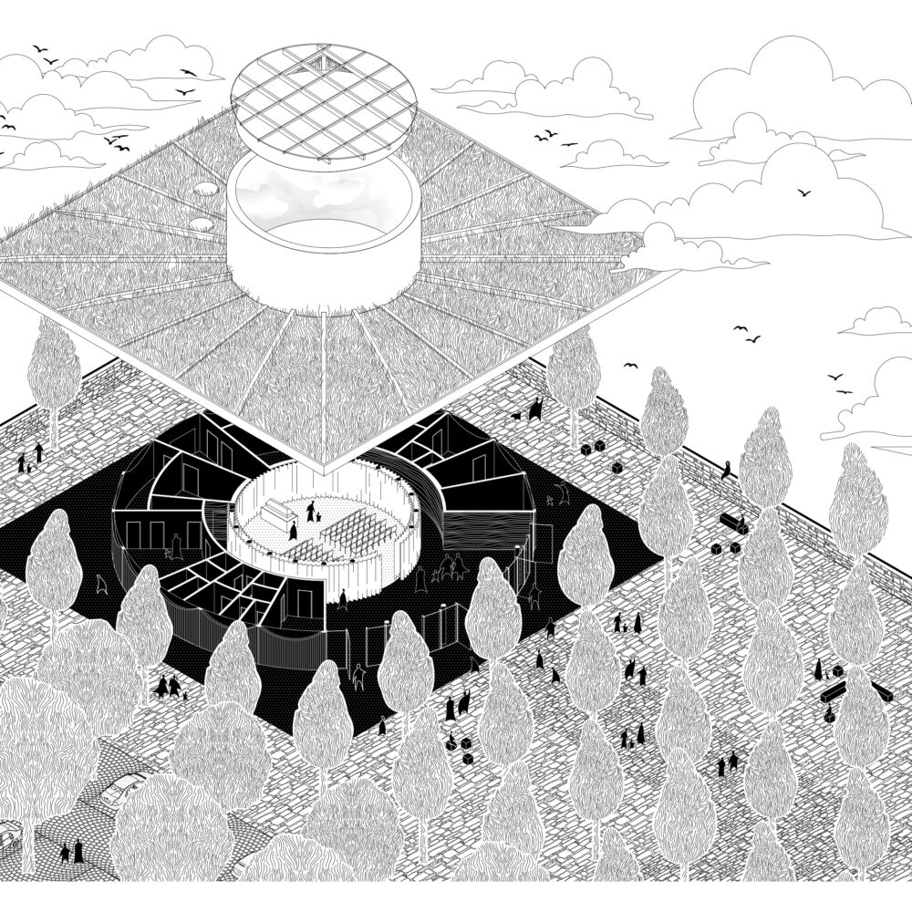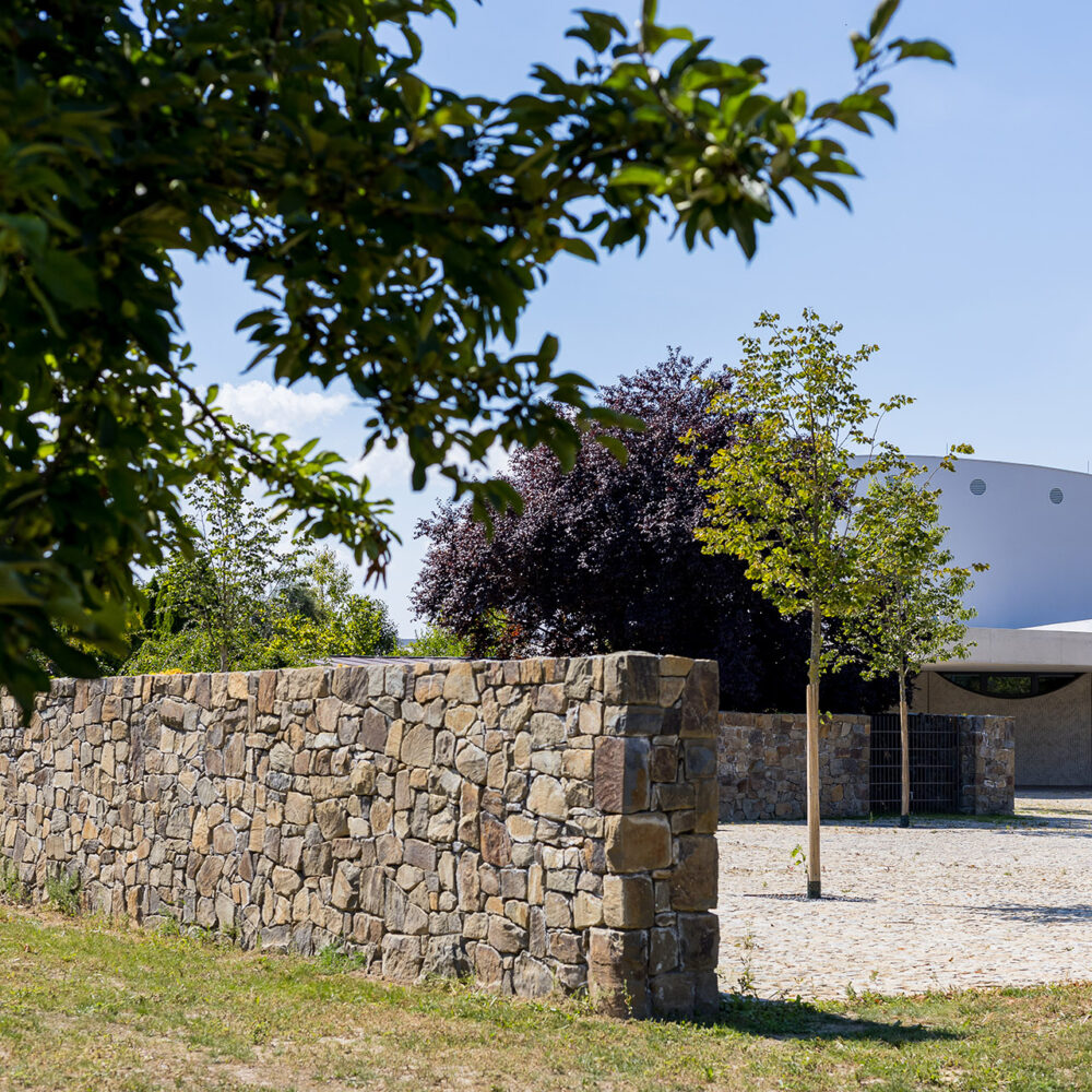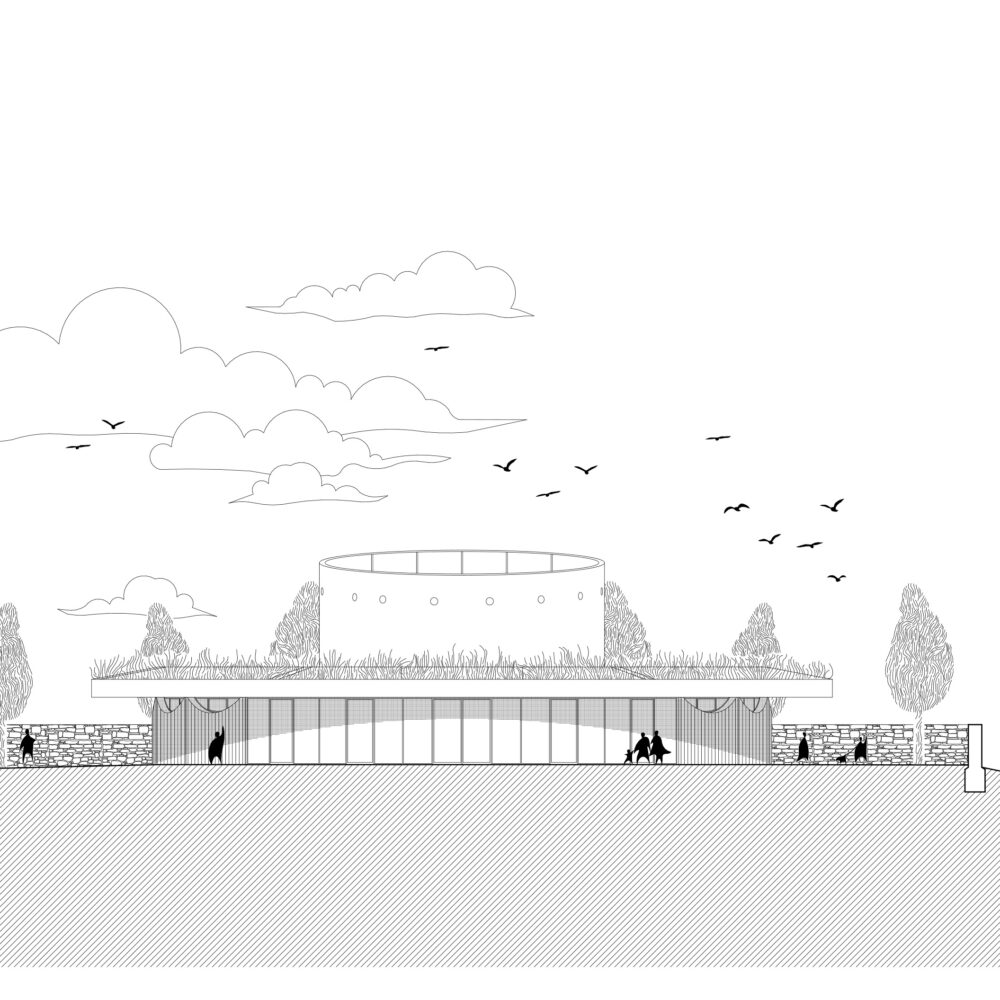 Předprostor obřadní síně definujeme kamennými zdmi a vysazujeme v něm třešňový sad v pravidelném rastru. Mezi třešně vkládáme čtverec – místo smutečního setkávání, které je ve výšce 3 m přikryto deskou. Tuto desku perforujeme vysokým válcem, jenž vytváří prostor posledního rozloučení. Architektura obřadní síně je tak založena na kontrastu barevném/světelném i geometrickém. Základní půdorys v kontextu urbanismu je čtvercový a tmavý, zatímco interiér má kruhový půdorys a bílou obřadní síň ve tvaru válce, kterou prosvětluje střešní světlík. Vnější tmavá betonová fasáda je zjemněna motivem labyrintu, který plní jak estetickou, tak symbolickou funkci. Povrch stěny v interiéru bílé obřadní síně je řešen jemnou nástěnnou abstraktní malbou.