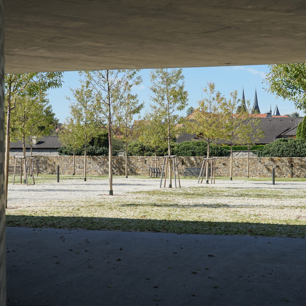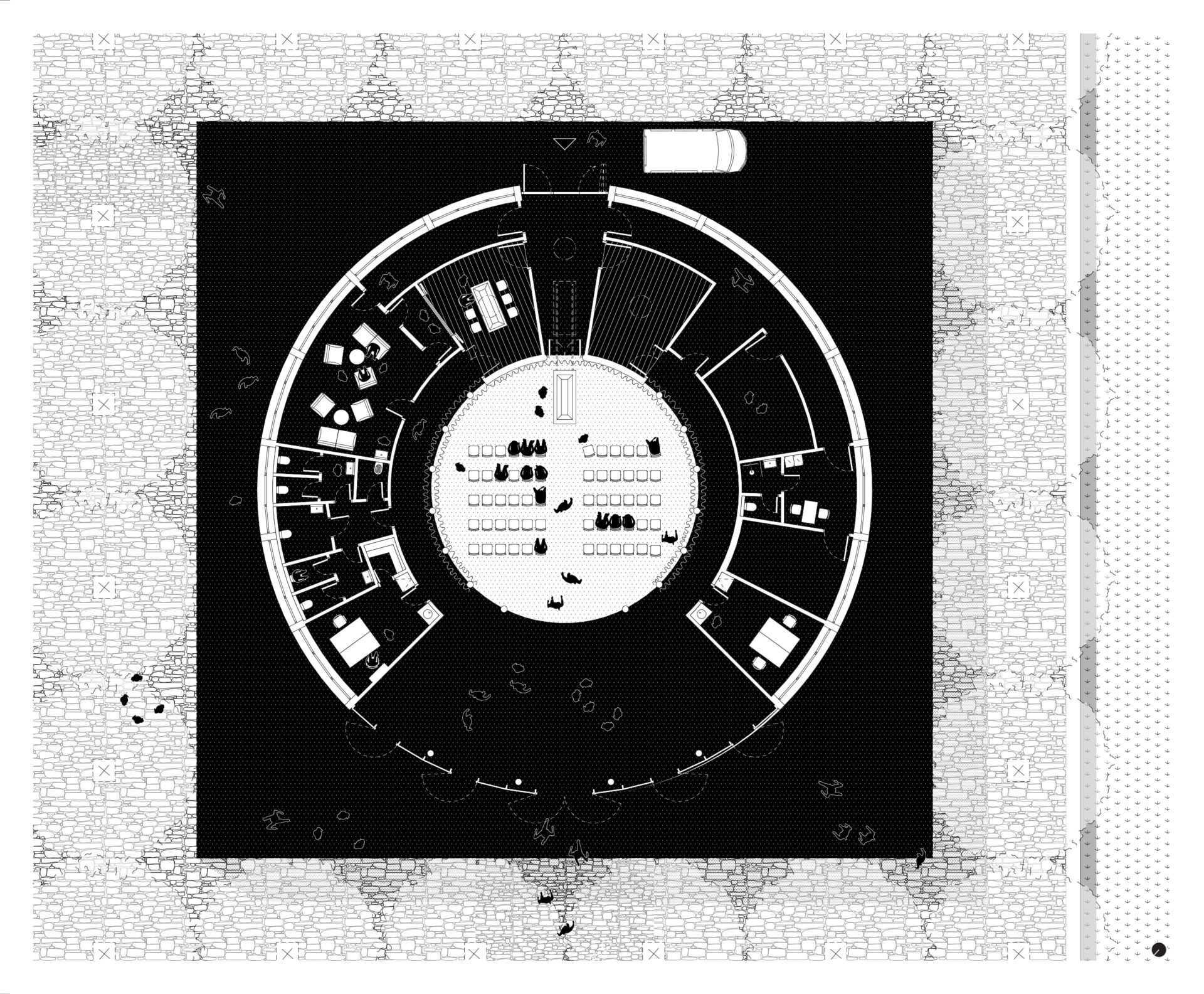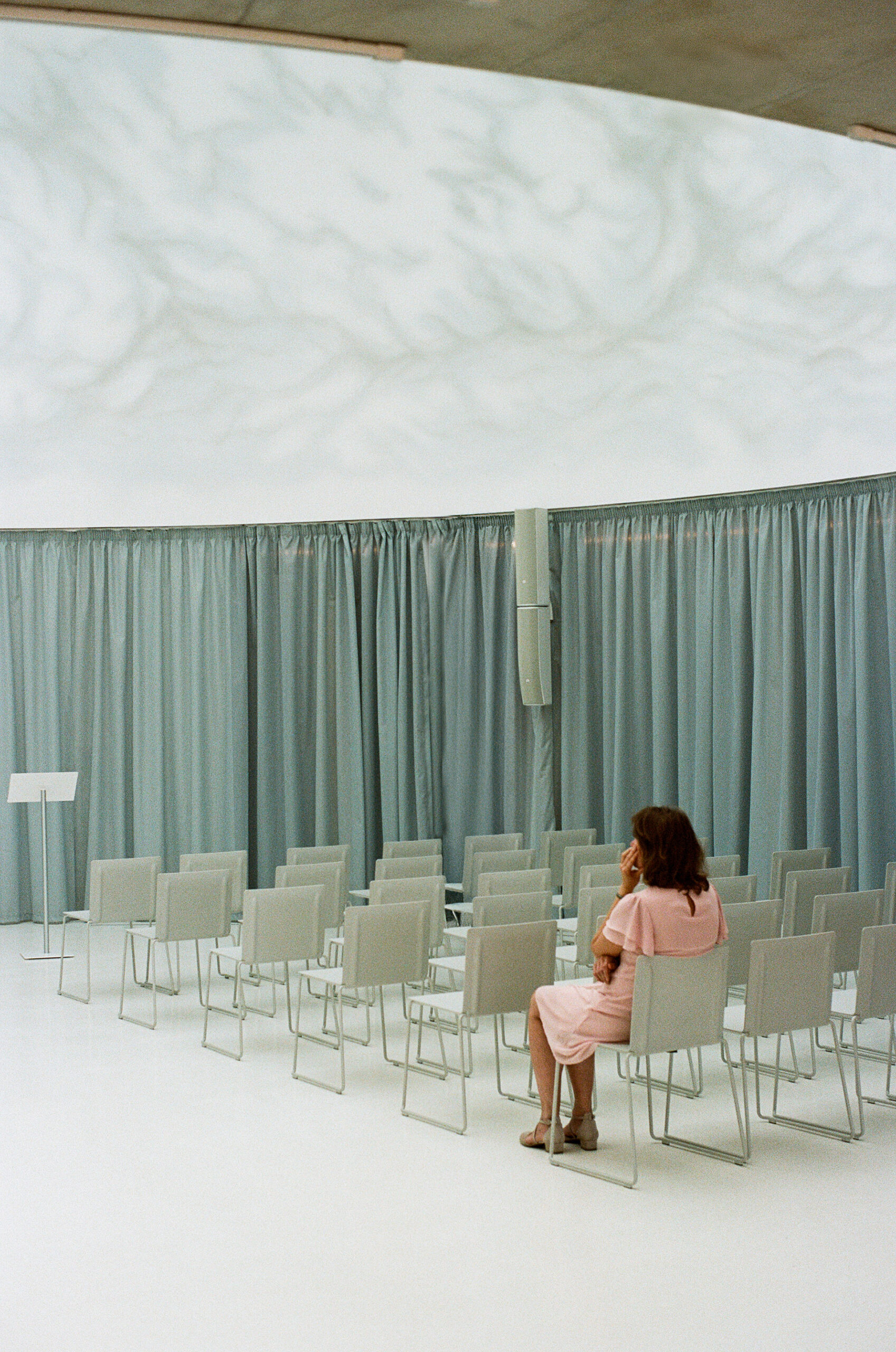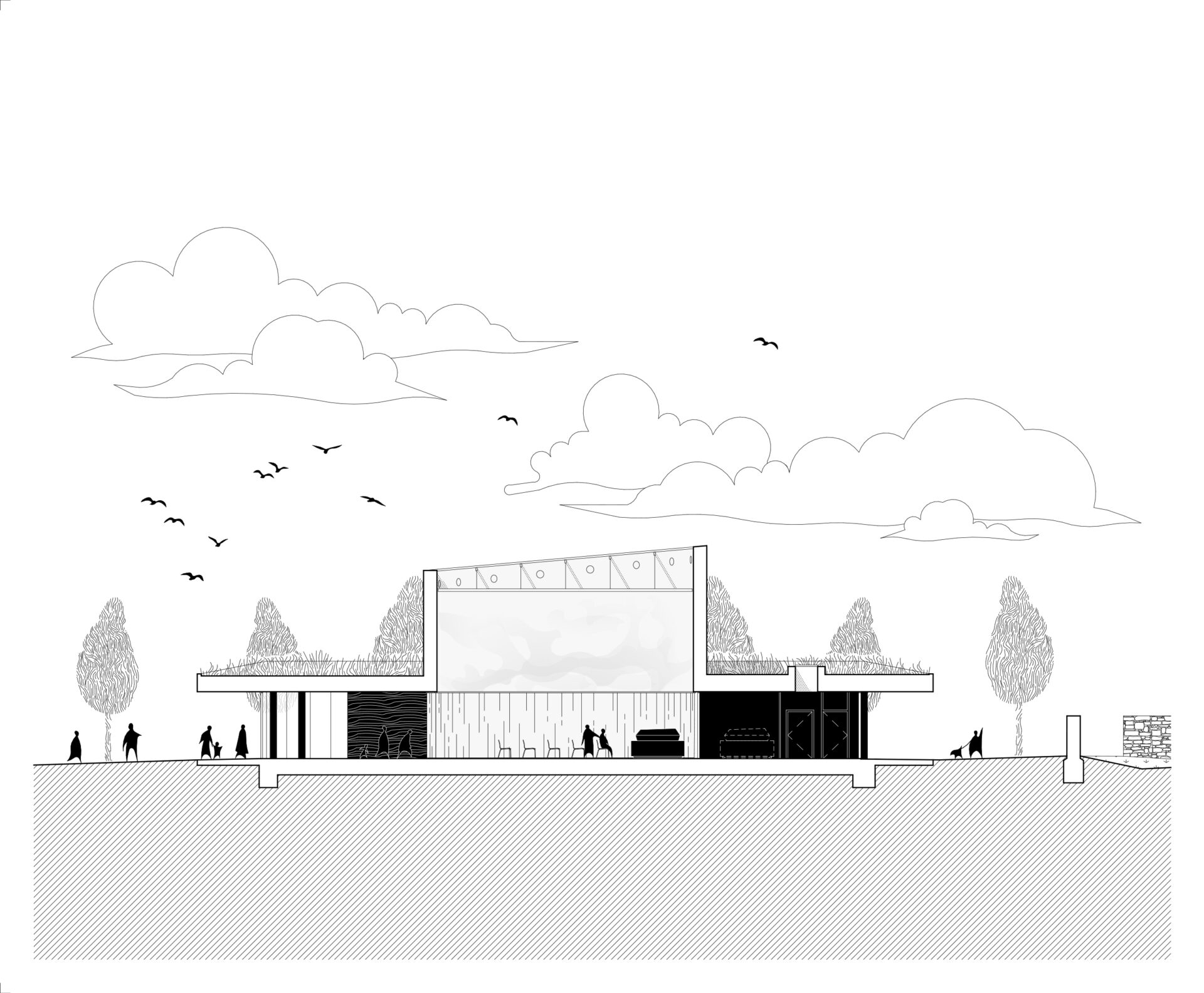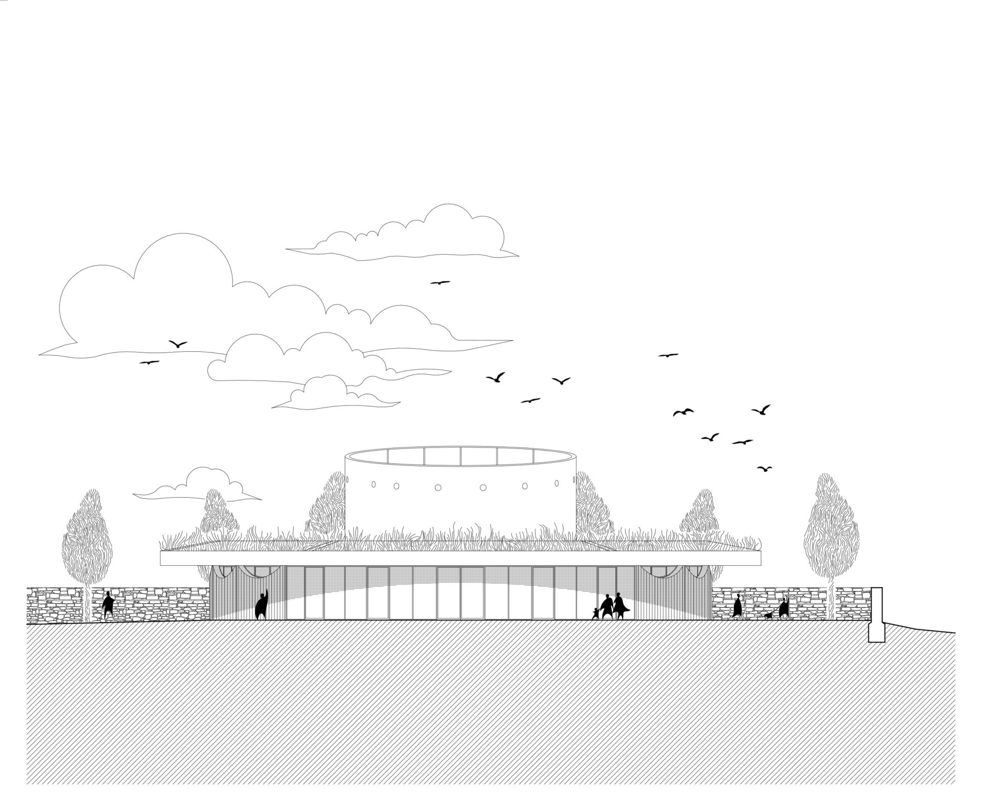 Předprostor obřadní síně definujeme kamennými zdmi a vysazujeme v něm třešňový sad v pravidelném rastru. Mezi třešně vkládáme čtverec – místo smutečního setkávání, které je ve výšce 3 m přikryto deskou. Tuto desku perforujeme vysokým válcem, jenž vytváří prostor posledního rozloučení. Architektura obřadní síně je tak založena na kontrastu barevném/světelném i geometrickém. Základní půdorys v kontextu urbanismu je čtvercový a tmavý, zatímco interiér má kruhový půdorys a bílou obřadní síň ve tvaru válce, kterou prosvětluje střešní světlík. Vnější tmavá betonová fasáda je zjemněna motivem labyrintu, který plní jak estetickou, tak symbolickou funkci. Povrch stěny v interiéru bílé obřadní síně je řešen jemnou nástěnnou abstraktní malbou.