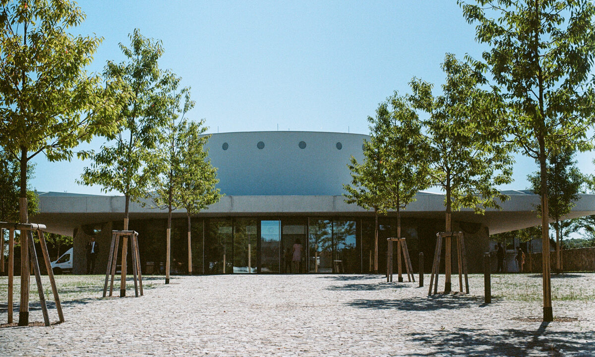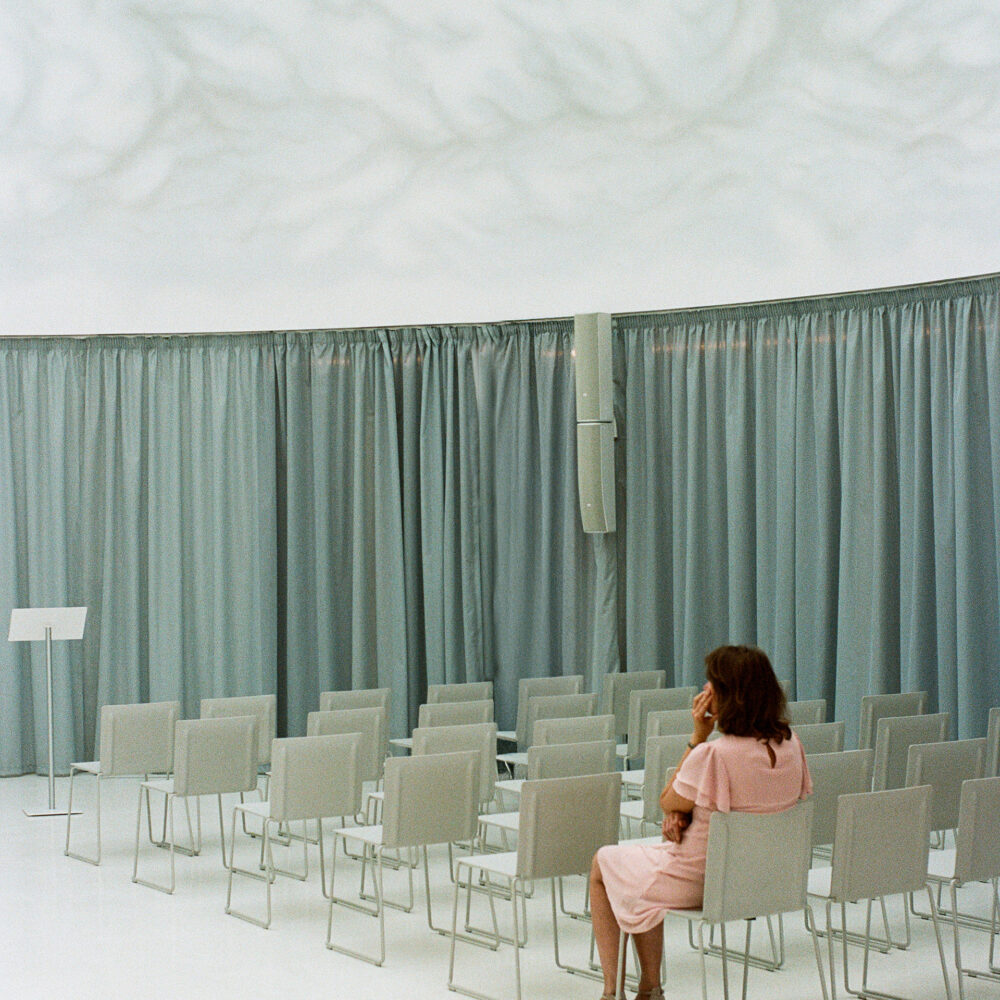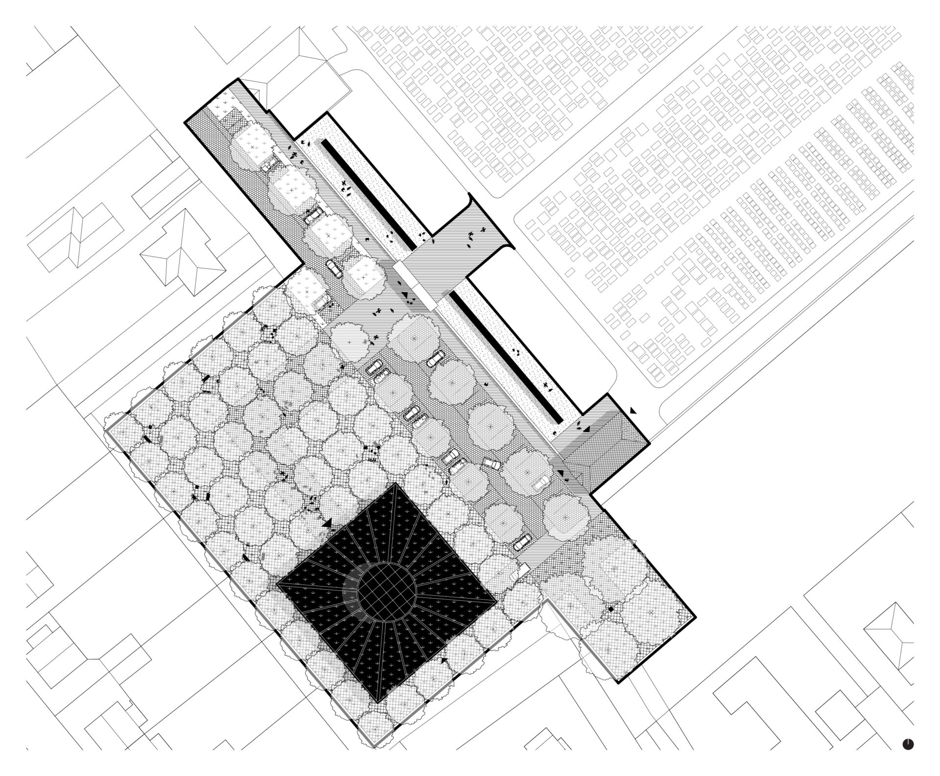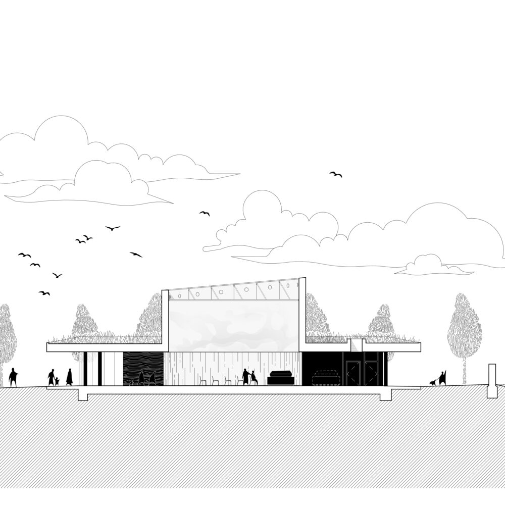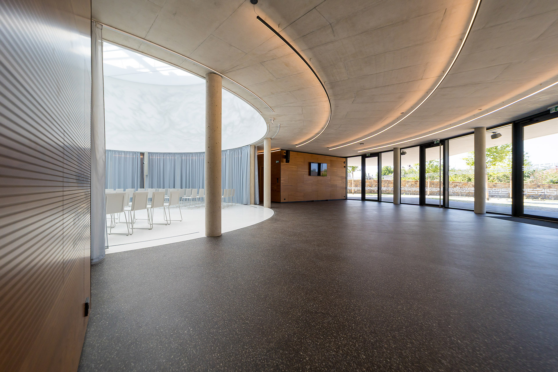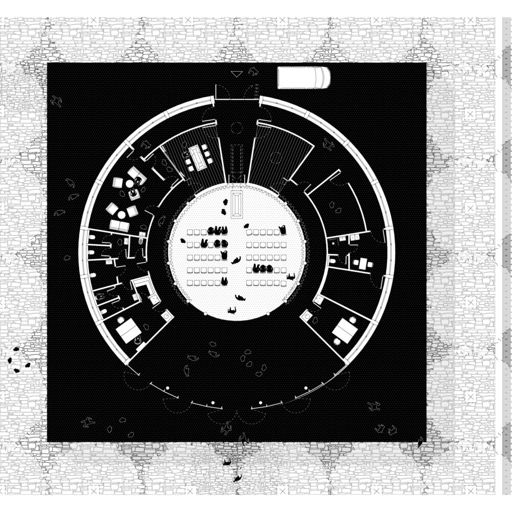 Předprostor obřadní síně definujeme kamennými zdmi a vysazujeme v něm třešňový sad v pravidelném rastru. Mezi třešně vkládáme čtverec – místo smutečního setkávání, které je ve výšce 3 m přikryto deskou. Tuto desku perforujeme vysokým válcem, jenž vytváří prostor posledního rozloučení. Architektura obřadní síně je tak založena na kontrastu barevném/světelném i geometrickém. Základní půdorys v kontextu urbanismu je čtvercový a tmavý, zatímco interiér má kruhový půdorys a bílou obřadní síň ve tvaru válce, kterou prosvětluje střešní světlík. Vnější tmavá betonová fasáda je zjemněna motivem labyrintu, který plní jak estetickou, tak symbolickou funkci. Povrch stěny v interiéru bílé obřadní síně je řešen jemnou nástěnnou abstraktní malbou.
