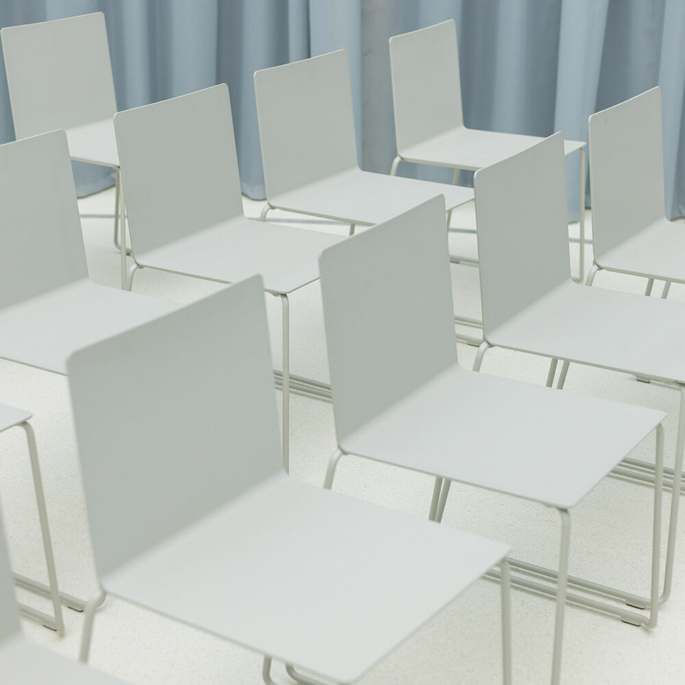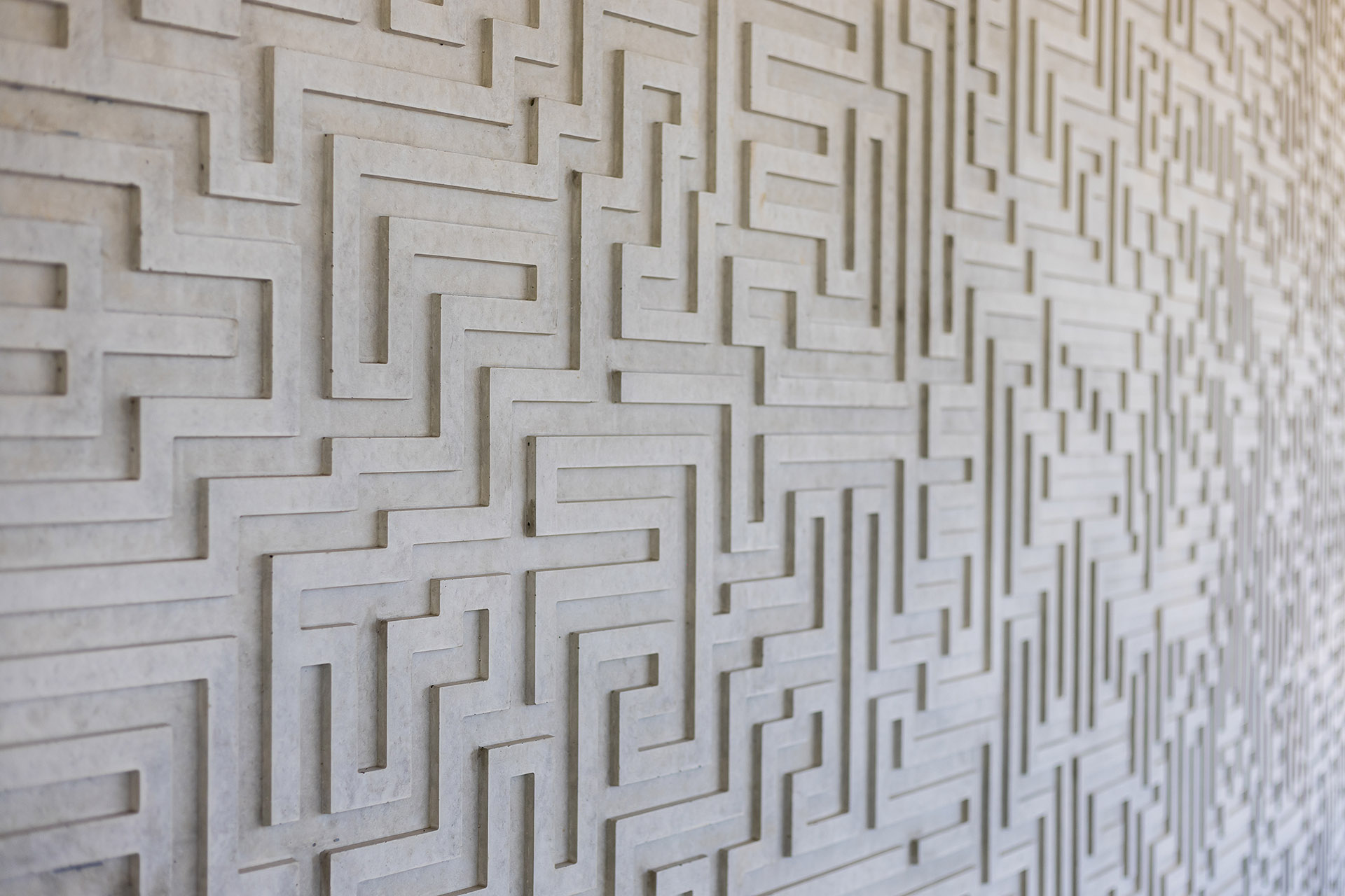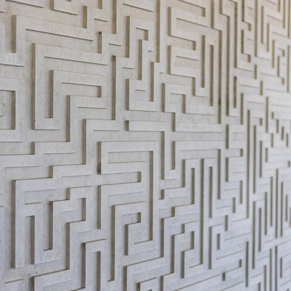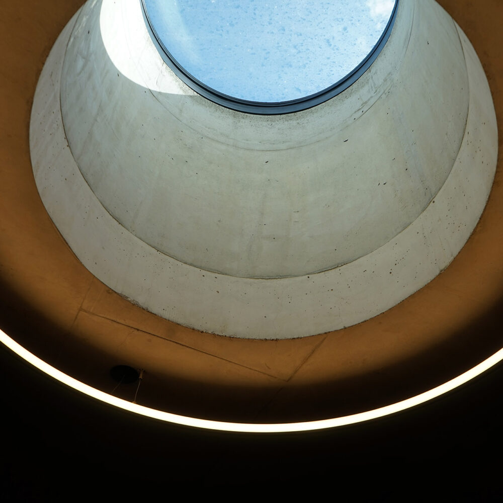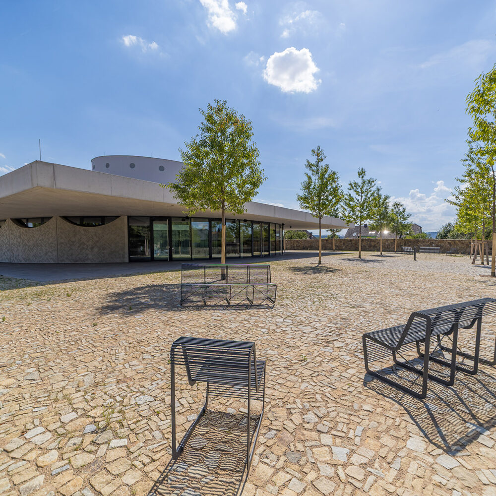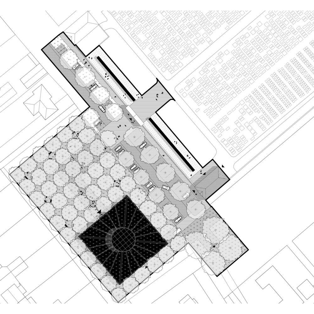 Předprostor obřadní síně definujeme kamennými zdmi a vysazujeme v něm třešňový sad v pravidelném rastru. Mezi třešně vkládáme čtverec – místo smutečního setkávání, které je ve výšce 3 m přikryto deskou. Tuto desku perforujeme vysokým válcem, jenž vytváří prostor posledního rozloučení. Architektura obřadní síně je tak založena na kontrastu barevném/světelném i geometrickém. Základní půdorys v kontextu urbanismu je čtvercový a tmavý, zatímco interiér má kruhový půdorys a bílou obřadní síň ve tvaru válce, kterou prosvětluje střešní světlík. Vnější tmavá betonová fasáda je zjemněna motivem labyrintu, který plní jak estetickou, tak symbolickou funkci. Povrch stěny v interiéru bílé obřadní síně je řešen jemnou nástěnnou abstraktní malbou.