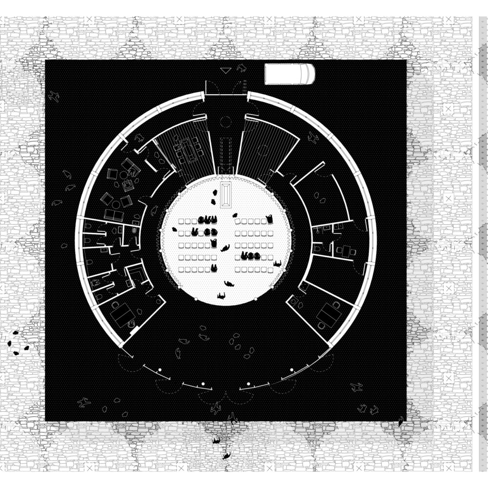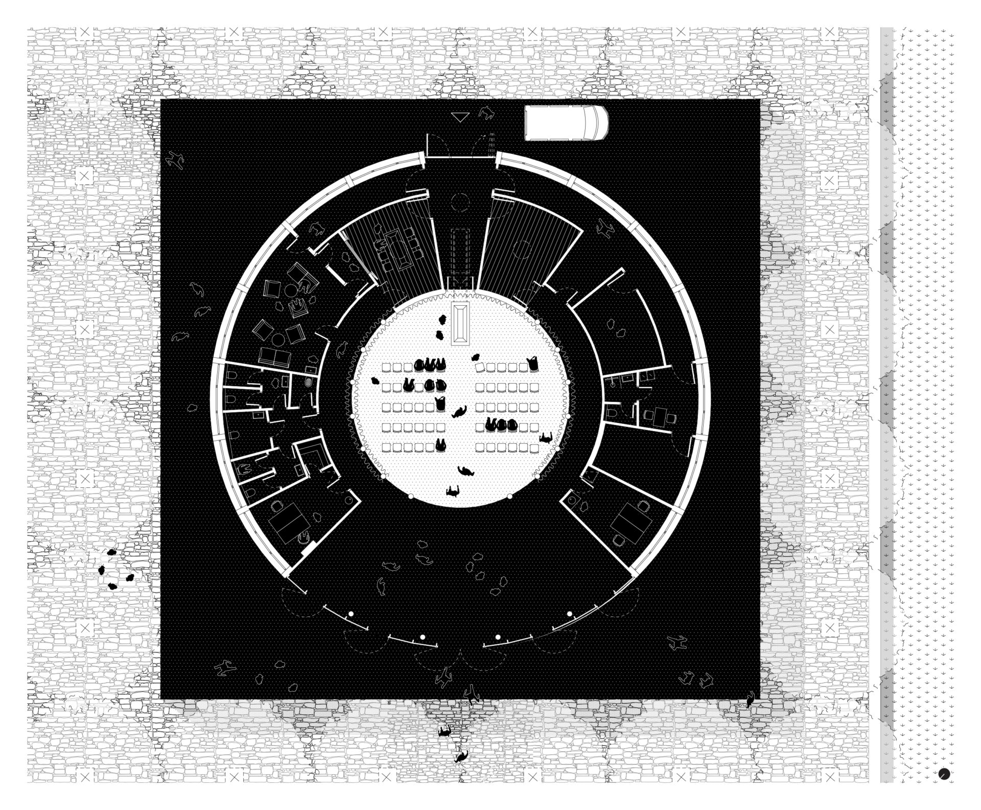 Předprostor smuteční síně definujeme kamennými zdmi a vysazujeme v něm třešňový sad v pravidelném rastru. Mezi třešně vkládáme plochu čtverce, který je ve výšce 3 m přikryt deskou. Tuto desku perforujeme vysokým válcem, jenž vytváří prostor posledního rozloučení. Architektura obřadní síně je tak založena na kontrastu barevném/světelném i geometrickém. Základní půdorys v kontextu urbanismu je čtvercový a tmavý, zatímco interiér síně má kruhový půdorys plně prosvětlen střešním světlíkem. Vnější tmavá betonová fasáda je zjemněna motivem labyrintu, který plní jak estetickou, tak symbolickou funkci. Povrch stěny v interiéru světlé obřadní síně je řešen jemnou nástěnnou abstraktní malbou. Součástí projektu jsou parterové úpravy předprostoru hřbitova rekonstrukce márnice na veřejné toalety a zázemí hrobníka a nové kolumbárium, které je umístěno v těsné souvislosti se vstupem na hřbitov.