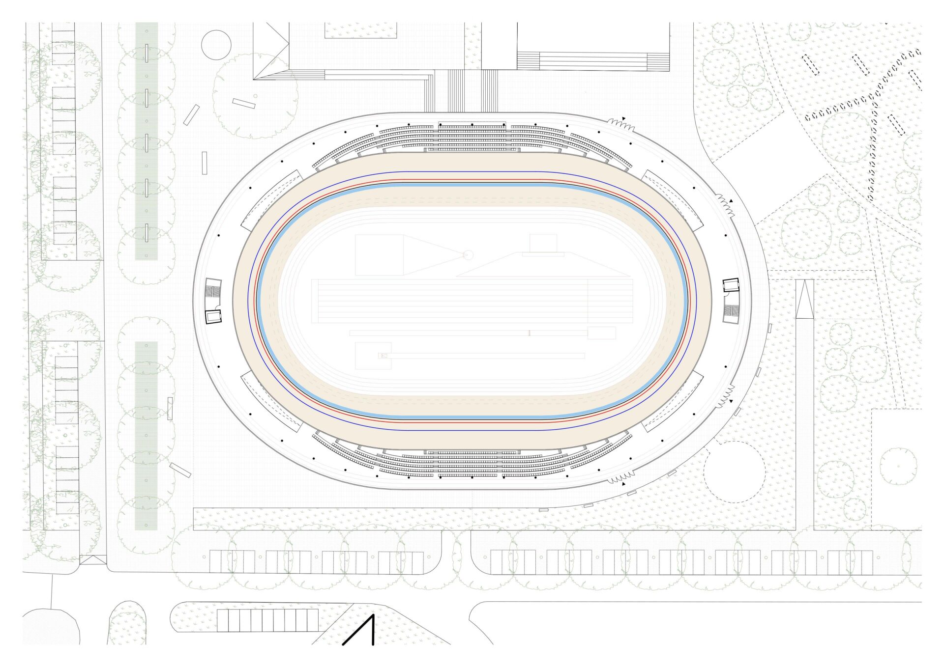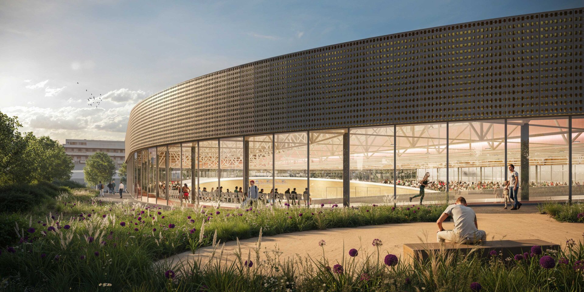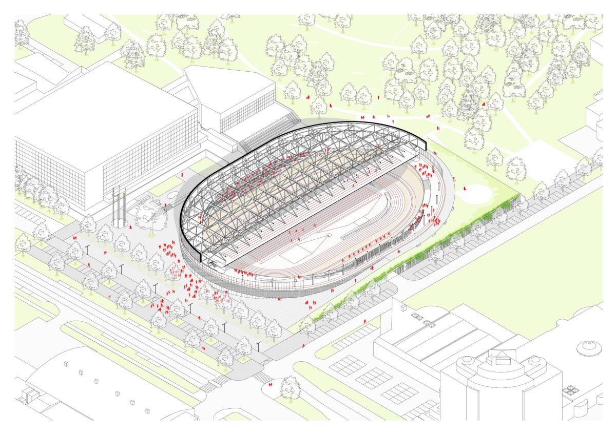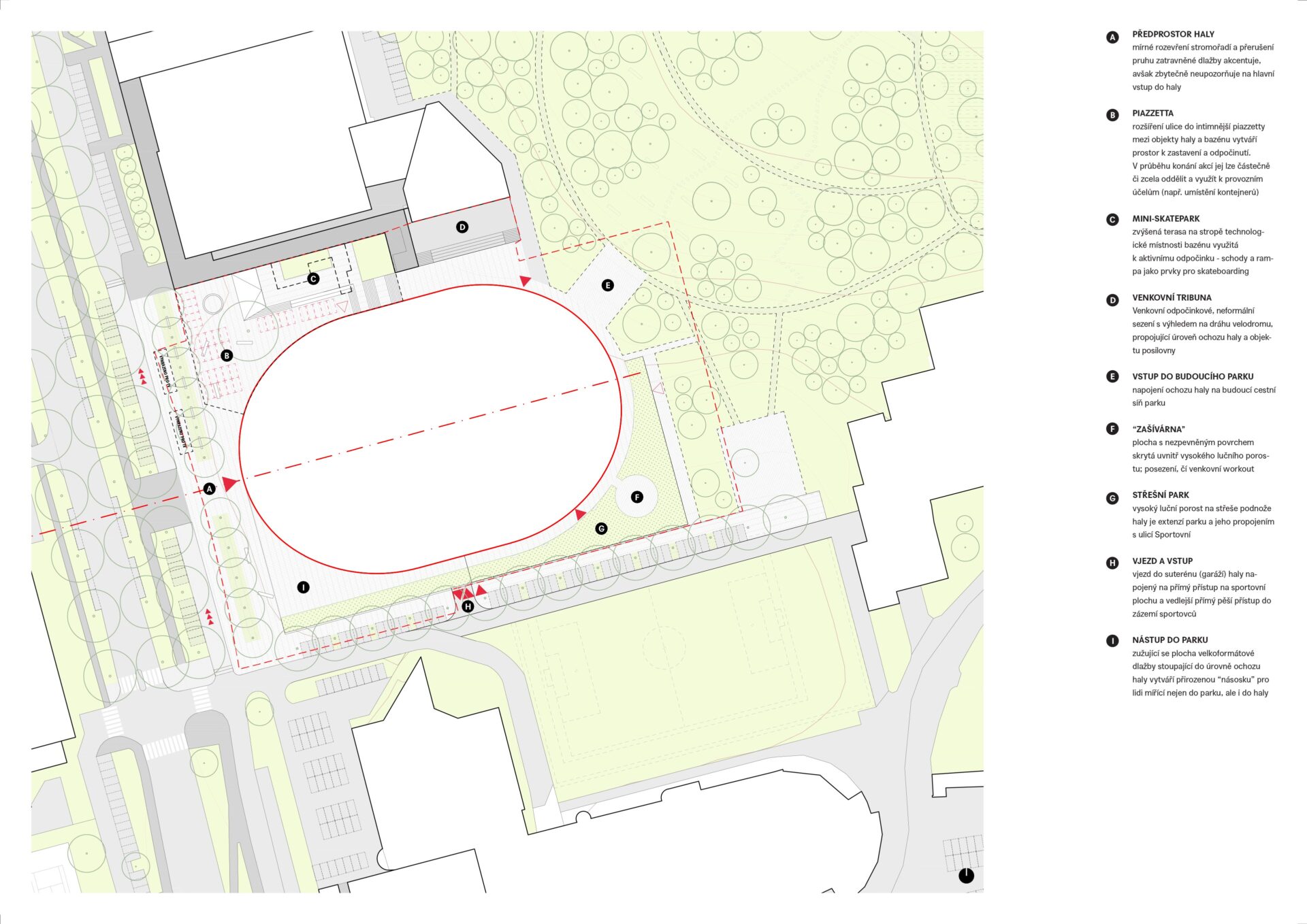 Objem budovy vychází z elementárního tvaru oválu cyklistické dráhy. Vyrůstá z krajiny a svým parterem vytváří hlavní vstup do parku Planýrka. Nezaměnitelná křivka cyklistické dráhy se z půli vznáší nad ulicí Sportovní a z půli sleduje zelený kopec Planýrky, u kterého se potkávají trasy nadšených fanoušků sportu s trasami nedělních výletníků. V konstrukci střechy je zavěšena tréninková atletická dráha. Z tribuny sledujeme současně závody na ovále i trénující atlety ve střešní konstrukci. Pohyb se prolíná s okolním městským parterem a krajinou. Fasádu haly tvoří jemný ornament prolisovaný ve zlatém plechu. Tento detail jer reminiscencí brány stávajícího legendárního velodromu, za níž se odehrávaly slavné dny brněnské cyklistiky.